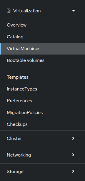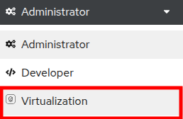 Virtualization パースペクティブは、Red Hat OpenShift Virtualizationがインストールされ、適切に構成されている場合のみ利用可能です。このラボ環境では、インストールと構成はすでに実行済みです。 |