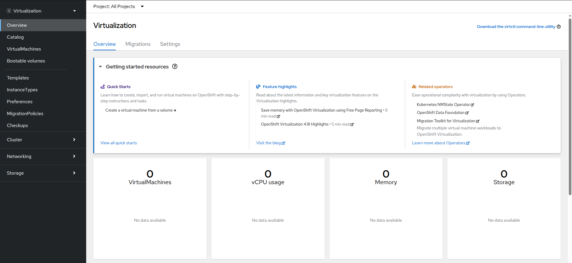 Virtualization ビューに到着すると、現在使用中のすべての仮想化リソースの概要を表示する Overview ページが表示されます。少し時間を取って探索してみましょう。