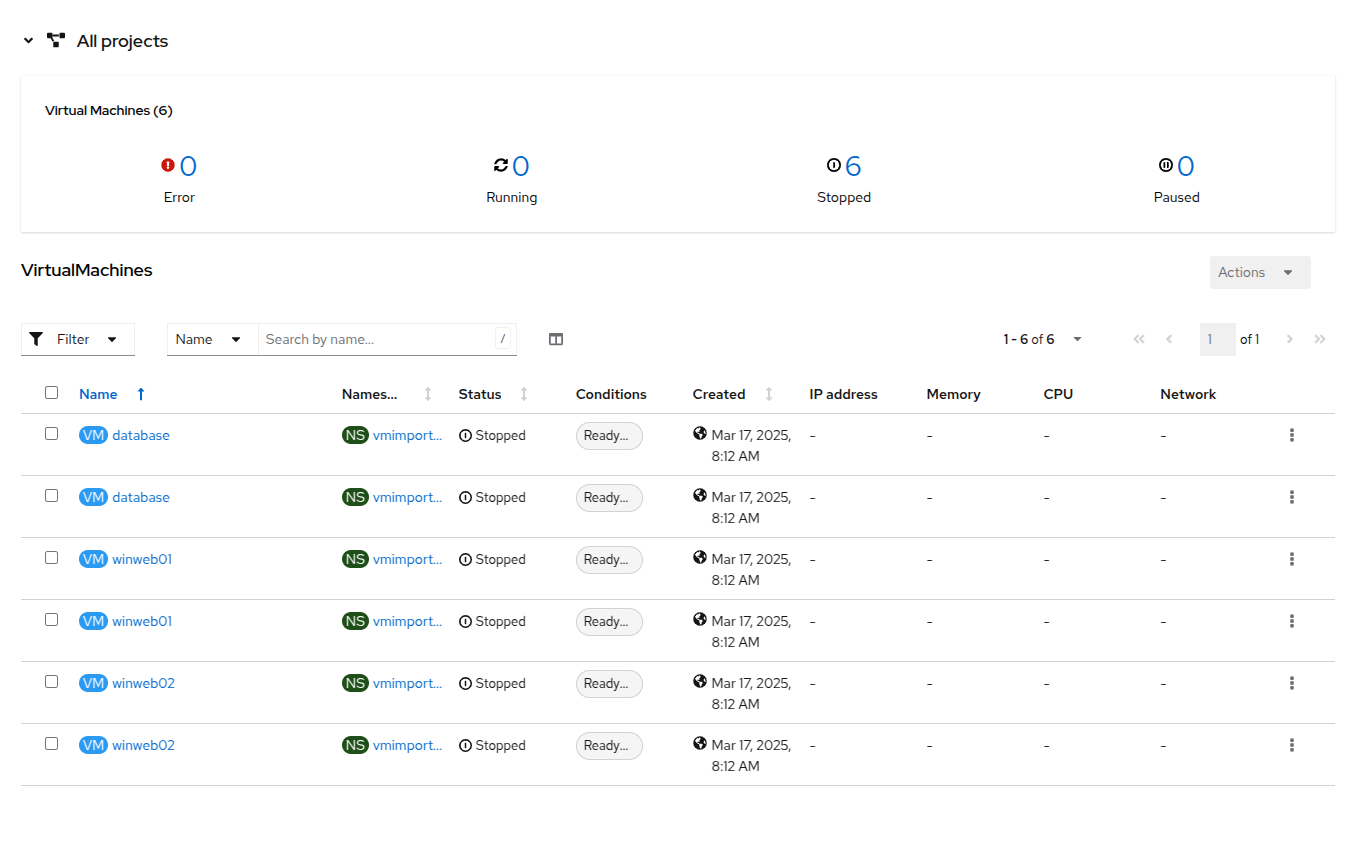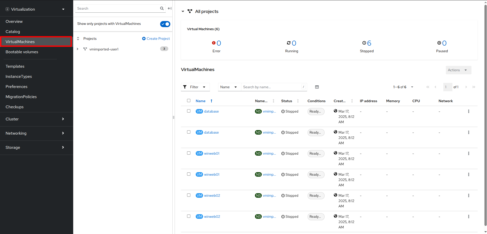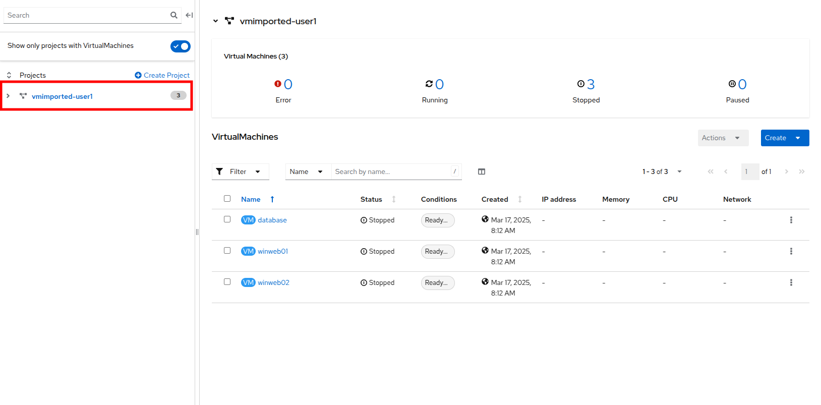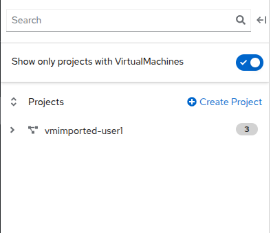 前述の中央の列はプロジェクトビューです。OpenShiftの他のオブジェクトと同様に、プロジェクト(Kubernetesのネームスペースの抽象化)は、ユーザーがリソースを使用および管理する際に必要な権限やその他の要素が適用される管理画面です。デフォルトでは、ここにスライダーがあり、既存のVMを持つプロジェクトのみが表示されます。現在、表示できるプロジェクトは vmimported-{user} のみです。これは、仮想マシンにアクセスできる唯一のプロジェクトだからです。