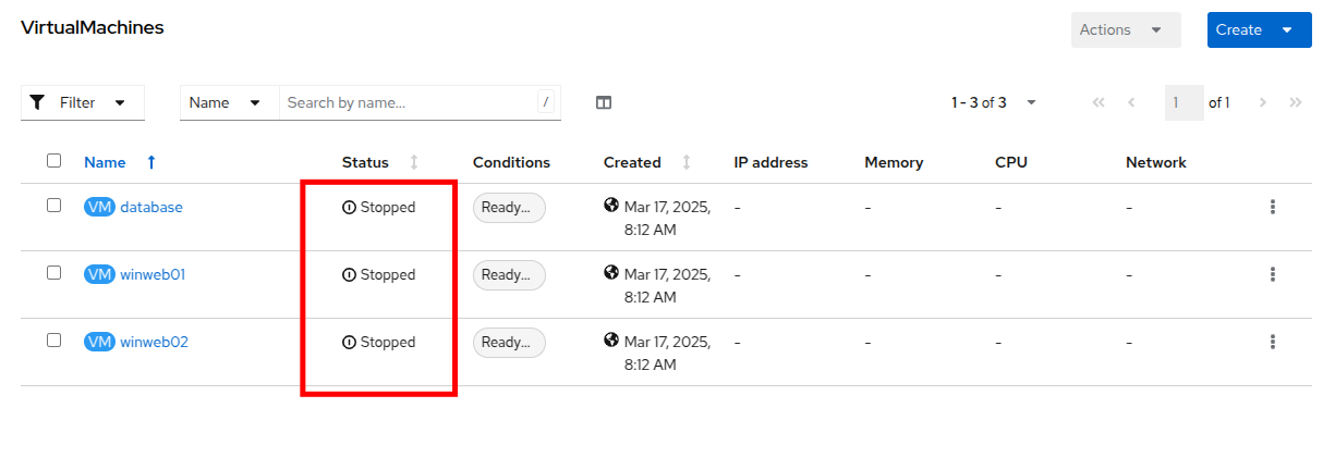 仮想マシンの概要の列には、vmimported-{user} プロジェクト内の仮想マシンだけが表示されます。3つのVMがリスト表示されますが、現在はオンになっていません。これらはラボの後半部分で使用します。