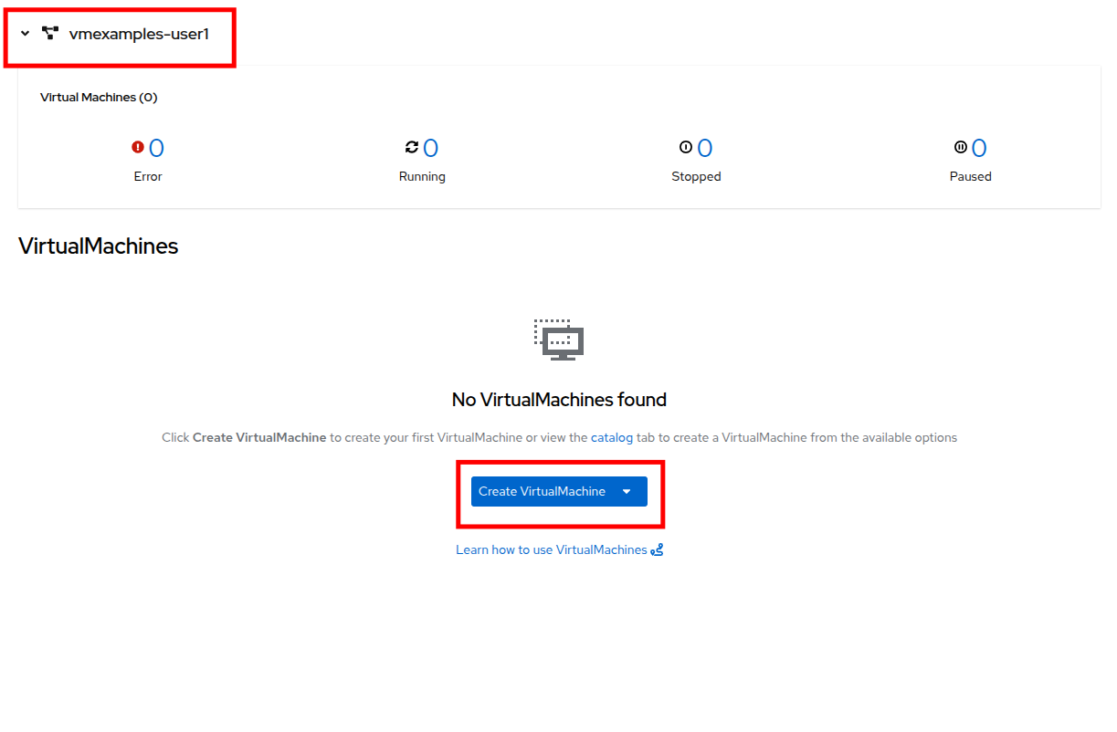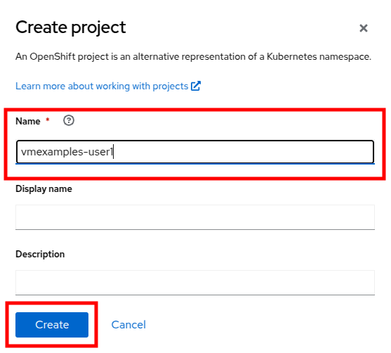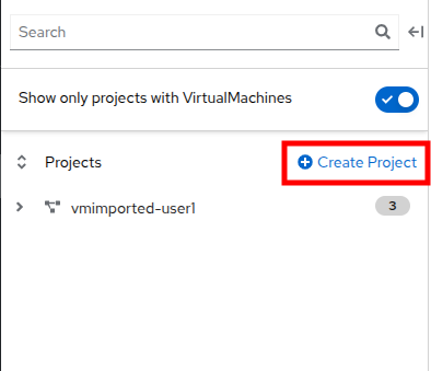 VMを作成する前に、新しいプロジェクトを作成する必要があります。仮想マシンは特定のプロジェクト、またはネームスペースにデプロイされ、デフォルトでは、ネームスペースへのアクセス権限のないユーザーは、仮想マシンにアクセス、管理、制御できません。管理者はすべてのプロジェクトにアクセスでき、すべての仮想マシンを表示できますが、一般ユーザーは必要に応じてプロジェクトへのアクセス権限を付与する必要があります。