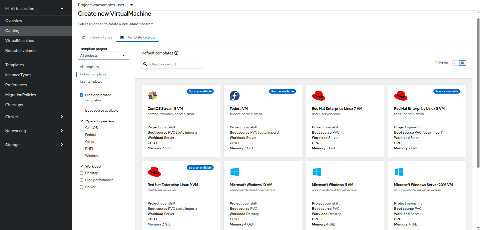 左側のメニューは、OpenShiftの仮想化統合機能の主なコントロールです。仮想マシンを構築するためのカタログ、テンプレート、インスタンスタイプなどの仮想化関連の項目や、仮想マシンのストレージとネットワークを設定するメニューが表示されています。