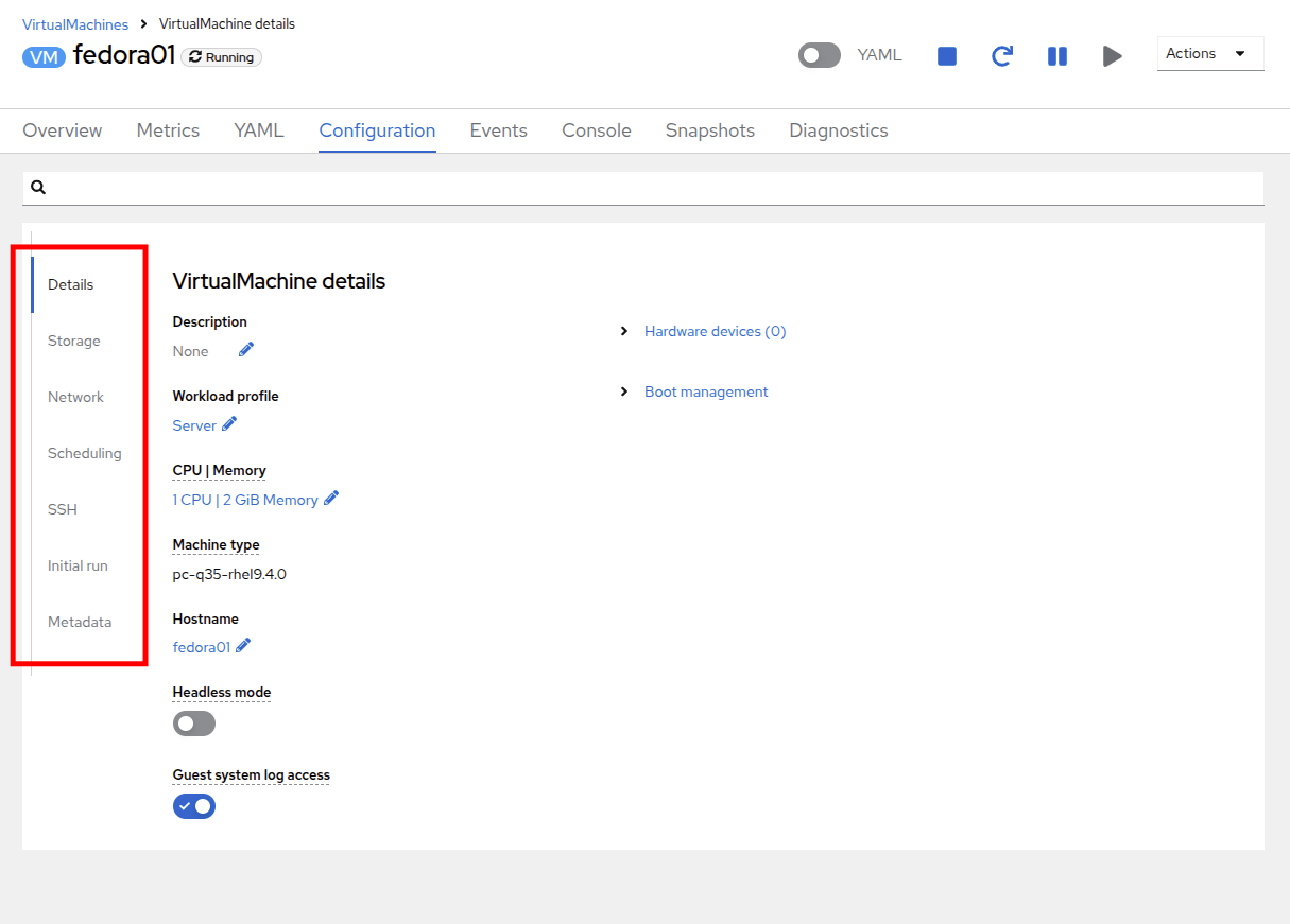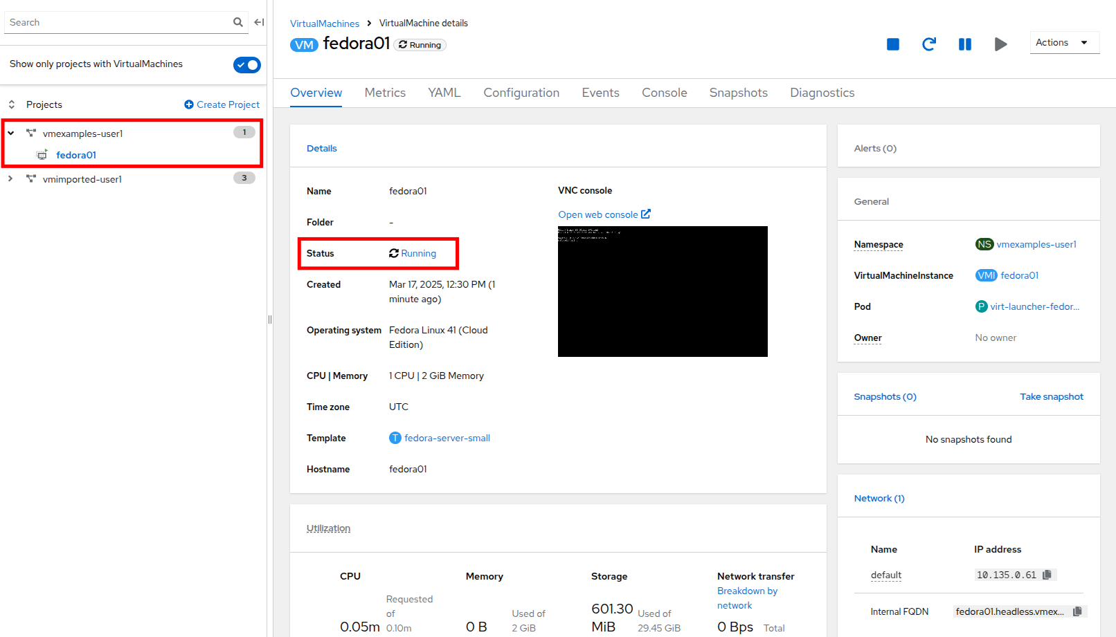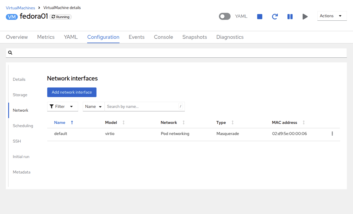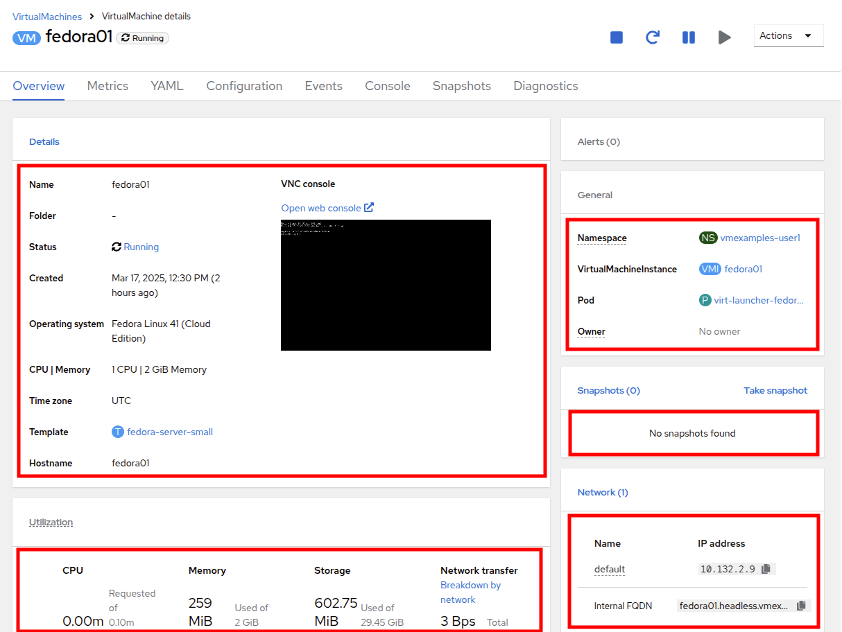 Network: このタイルでは、ソフトウェア定義ネットワーク(SDN)上の仮想マシンのIPアドレスと内部ホスト名が表示されます。高度なネットワークが定義されていない場合、VMは自動的にPodネットワークに接続されます。このラボの後半では、高度なネットワークオプションと、VMの接続性をカスタマイズする方法について説明します。