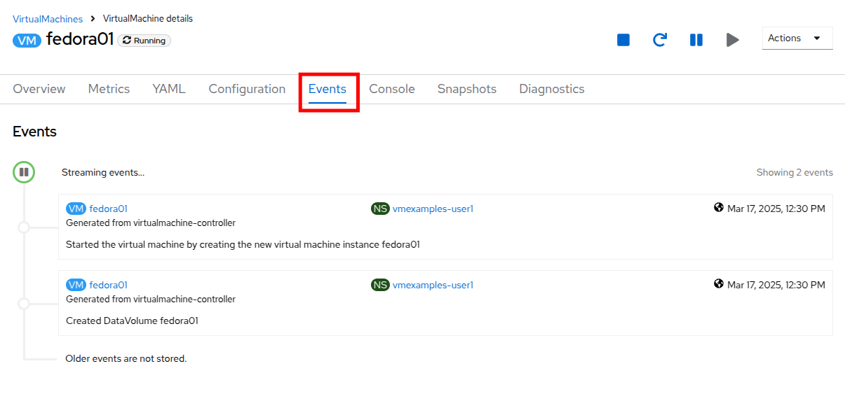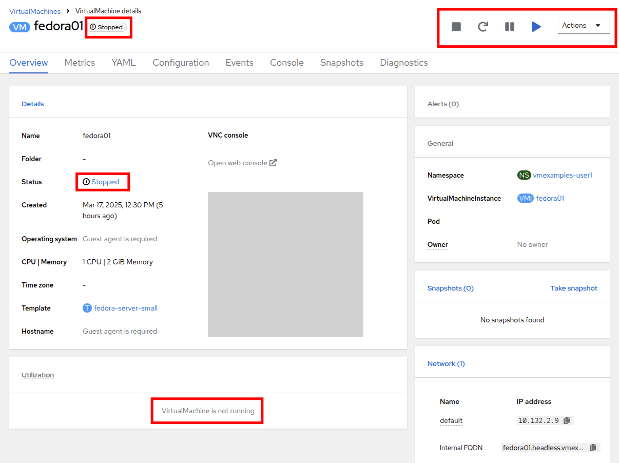 OpenShift コンソールを使用して VM の電源状態がどのように管理されるかを理解する