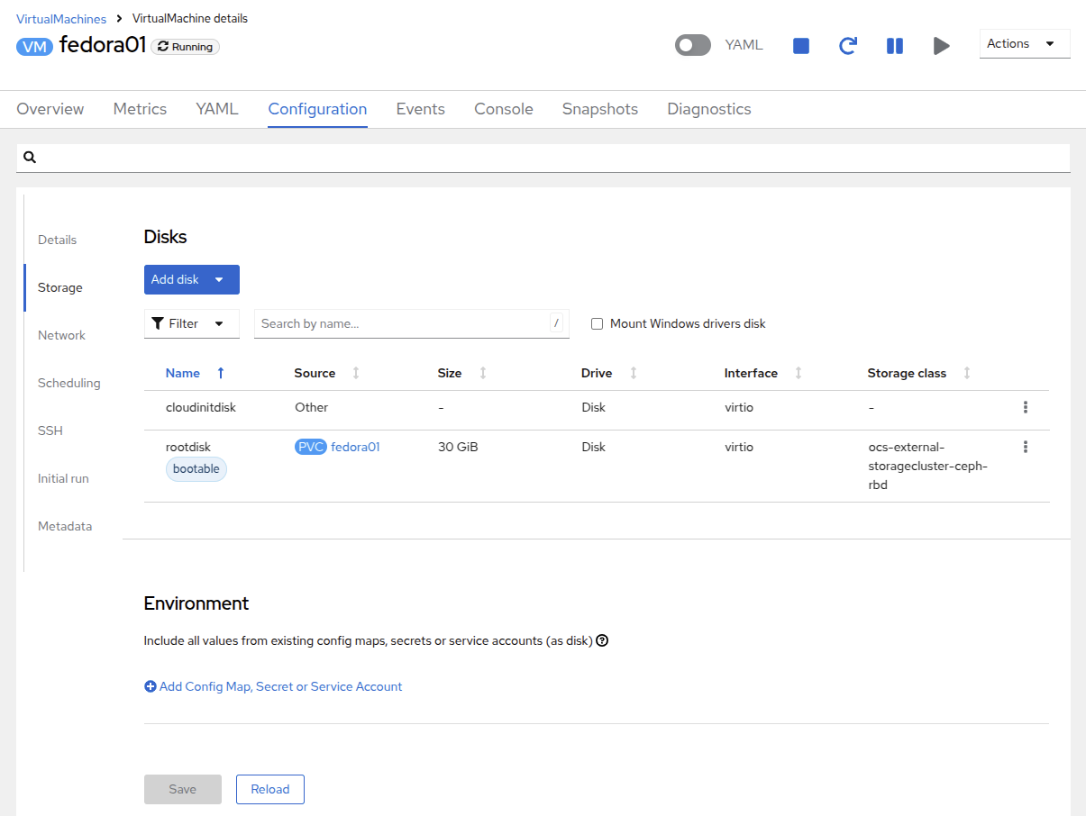 この環境では、ディスクに使用されるストレージのソースとタイプを定義するデフォルトの StorageClass は ocs-external-storagecluster-ceph-rbd と呼ばれます。 このストレージは、OpenShift Data Foundation (ODF) が仮想マシンの実行用に提供するデフォルトのタイプです。 各ストレージプロバイダには、VM ディスクをバックアップするストレージの特性を定義する異なるストレージクラスがあります。