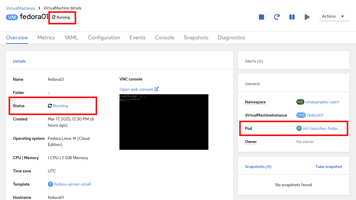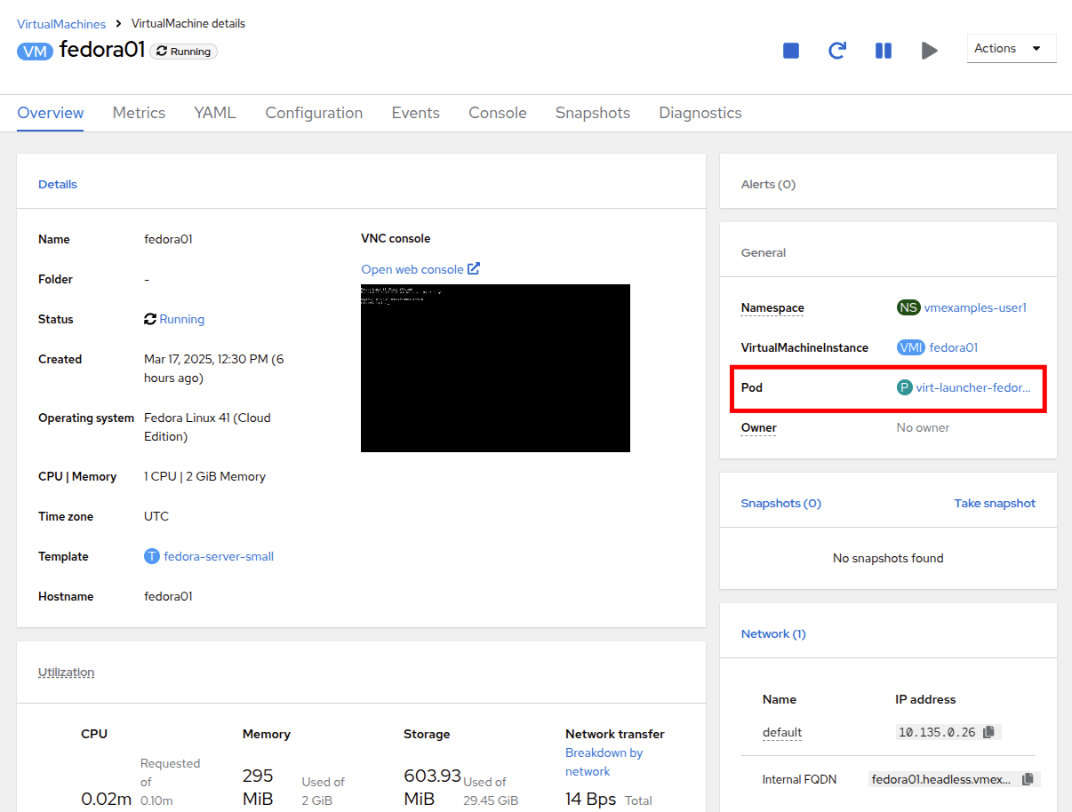 仮想マシンが稼働している物理ノードを確認するには、Overview ページの 一般 タイルの下にある Pod 名 virt-launcher-fedora01-uuid をクリックします。