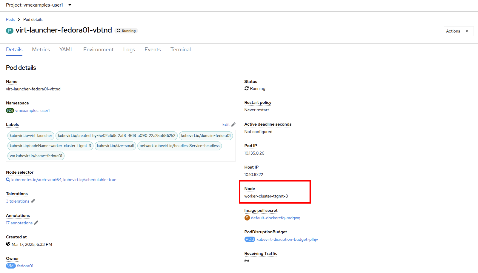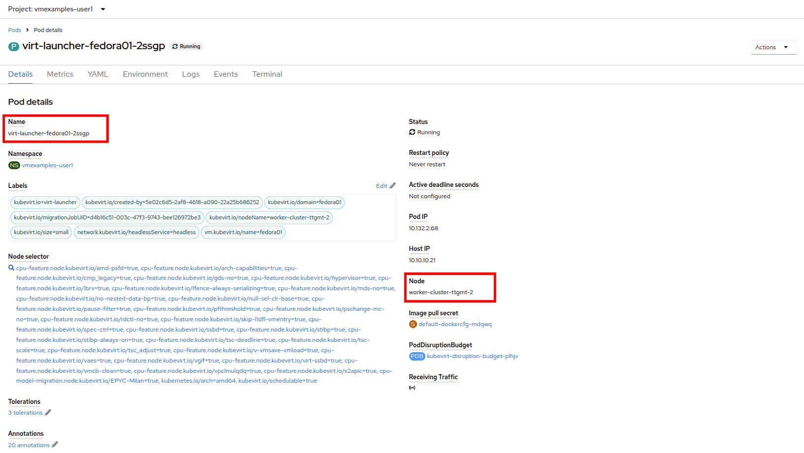 移行が完了すると、VMは Running ステータスに戻りますが、新しいノード上で稼働します。確認するために、virt-launcher-fedora01-uuid のPod名をクリックしてみましょう。