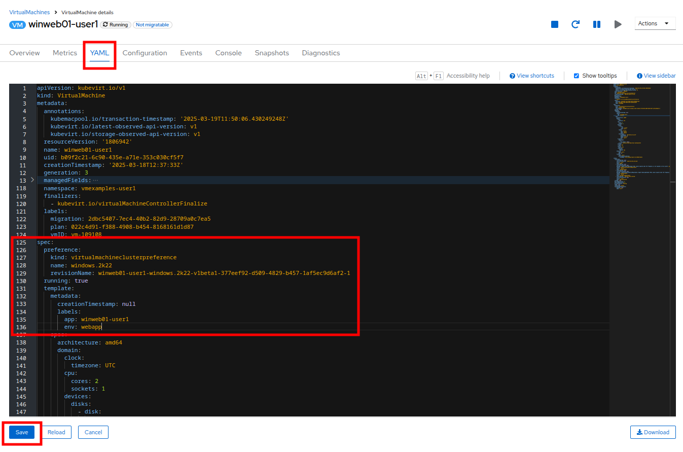 winweb01-{user} VMを選択し、YAML タブに移動します。
