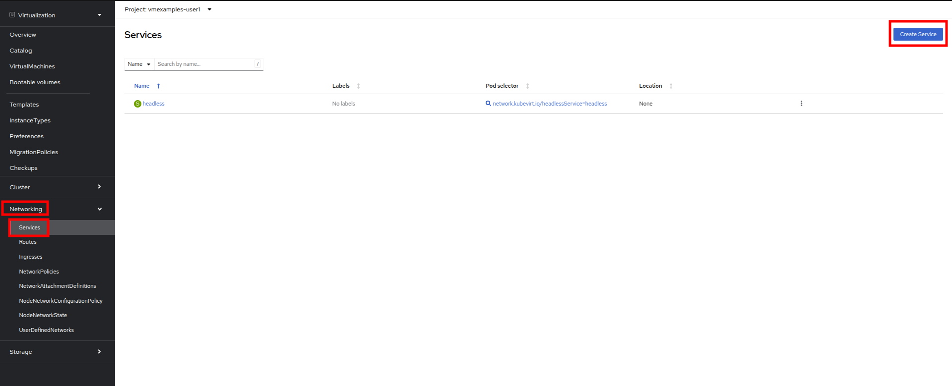左側のメニューで Networking を展開し、Services をクリックします。読み込まれた画面で、画面の隅にある Create Service ボタンをクリックします。