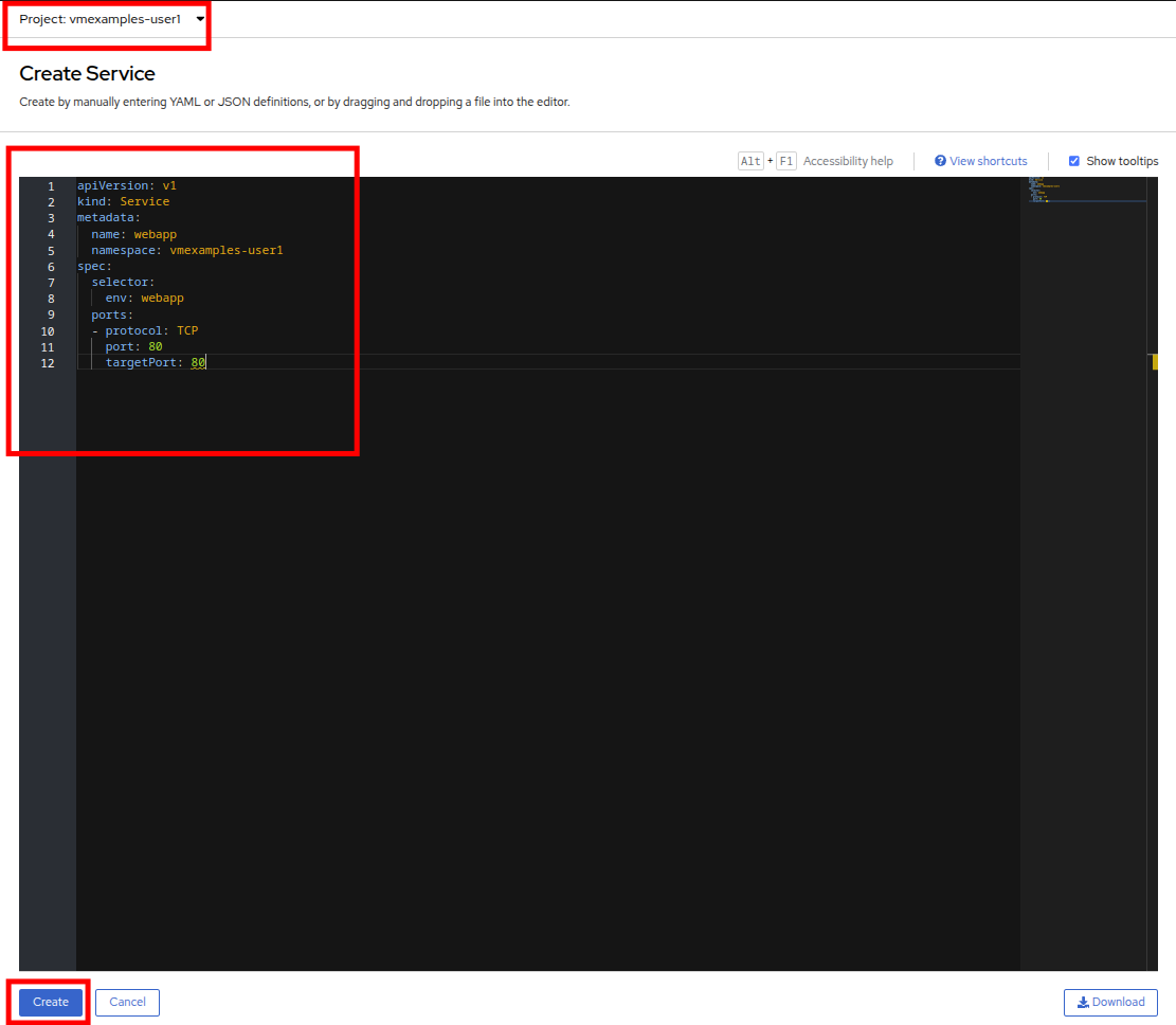 再度、Networking → Services に移動し、Create Service をクリックします。 YAML を以下の定義に置き換えます: