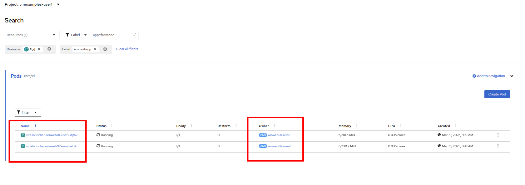 仮想マシンで使用する namespace (vmexamples-{user} または vmimported-{user})が、Service YAMLで使用されているものと同じであることを確認してください。 -