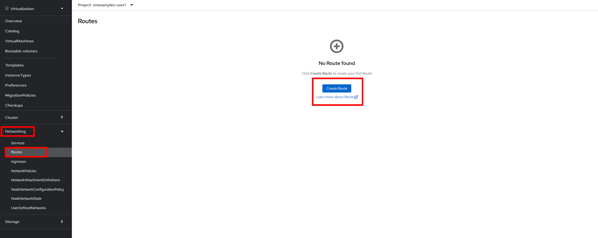 Networking の下で、左側のナビゲーションメニューの Routes オプションをクリックします。 画面中央の Create Route ボタンをクリックします。