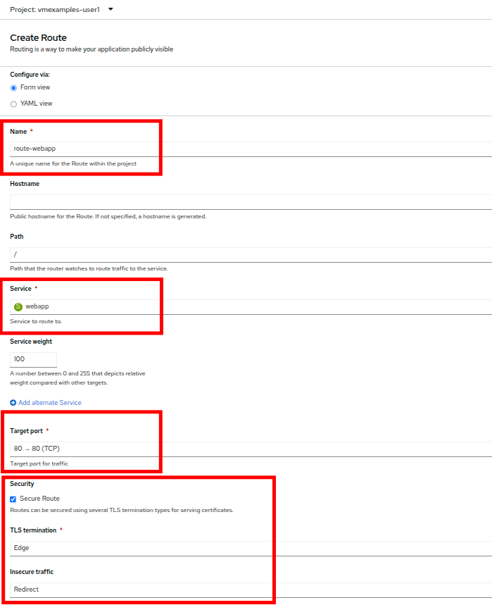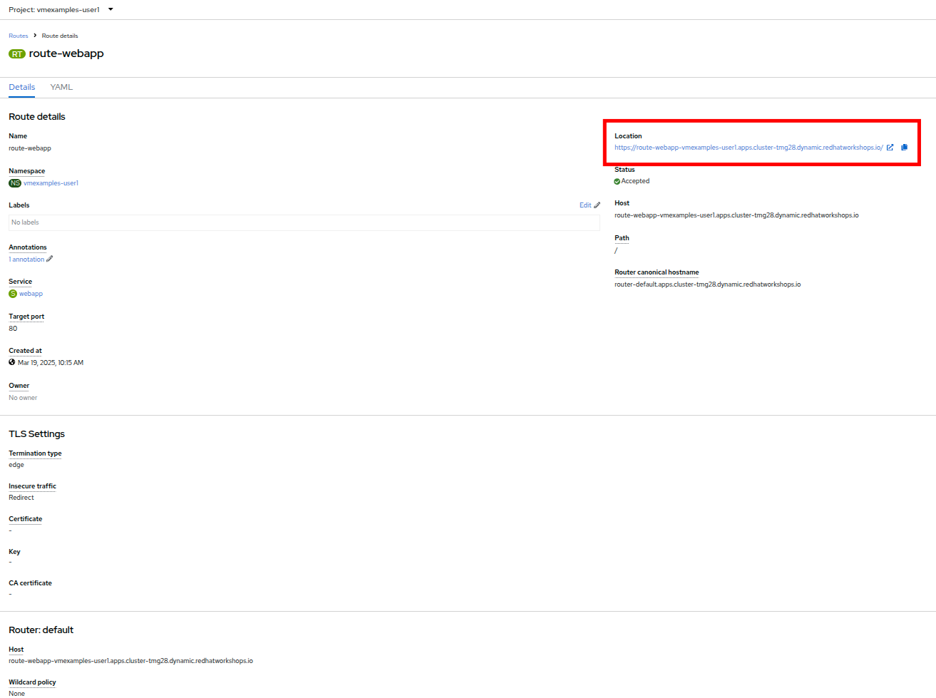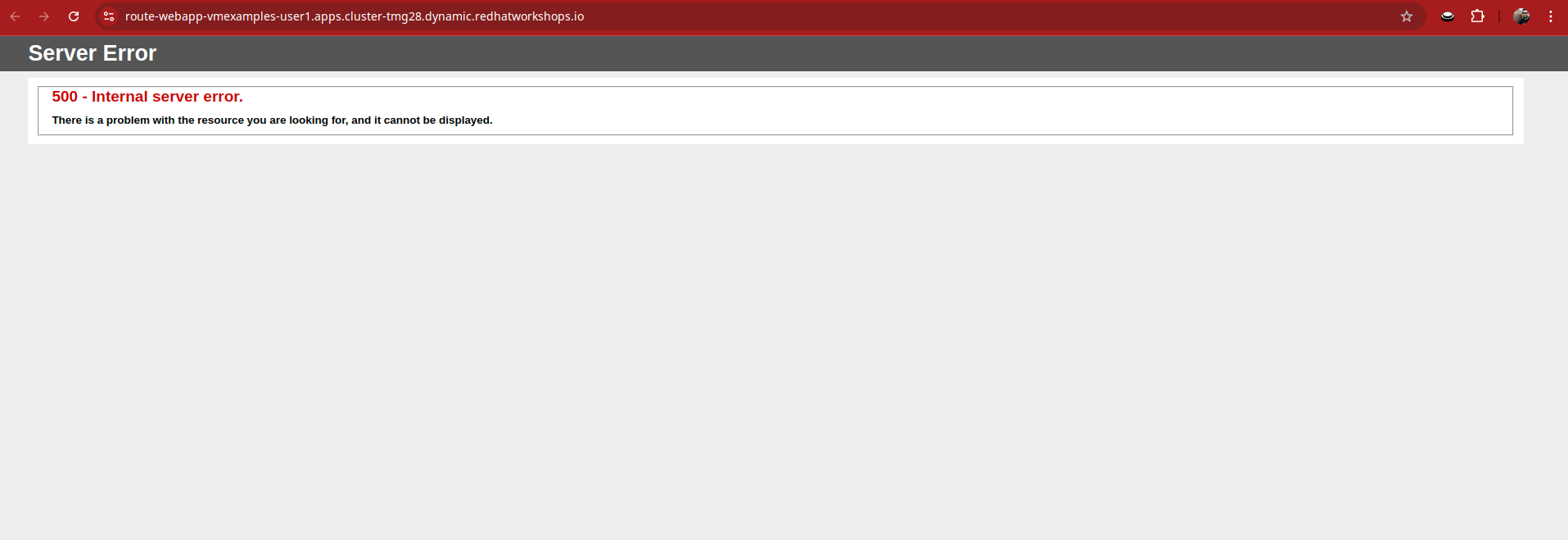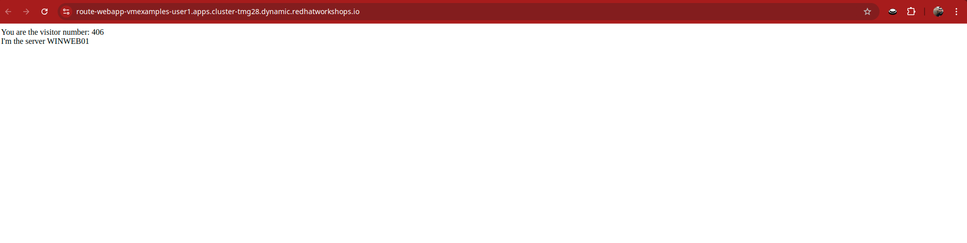 これで、Windows IIS サーバーは OpenShift クラスター内からアクセスできるようになりました。 他の仮想マシンは、Service名 + ネームスペース名から決定される DNS 名 webapp.vmexamples-{user} を使用して、それらにアクセスできます。しかし、これらの Web サーバーはアプリケーションのフロントエンドであるため、外部からアクセスできるようにしたいと思います。 これは Route を使用してパブリックに公開することで実現できます。