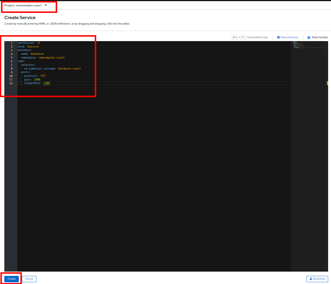 apiVersion: v1 kind: Service metadata: name: database namespace: vmexamples-{user} spec: selector: vm.kubevirt.io/name: database-{user} ports: - protocol: TCP port: 3306 targetPort: 3306