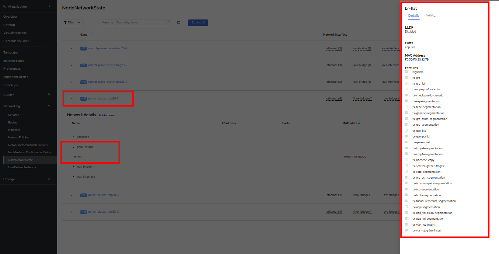 前述の通り、ワーカーノードにはこのモジュールで使用するためにすでにLinuxブリッジが構成されていることがわかります。ワーカーの1つを展開し、ブリッジ br-flat をクリックして、その詳細情報を表示します。