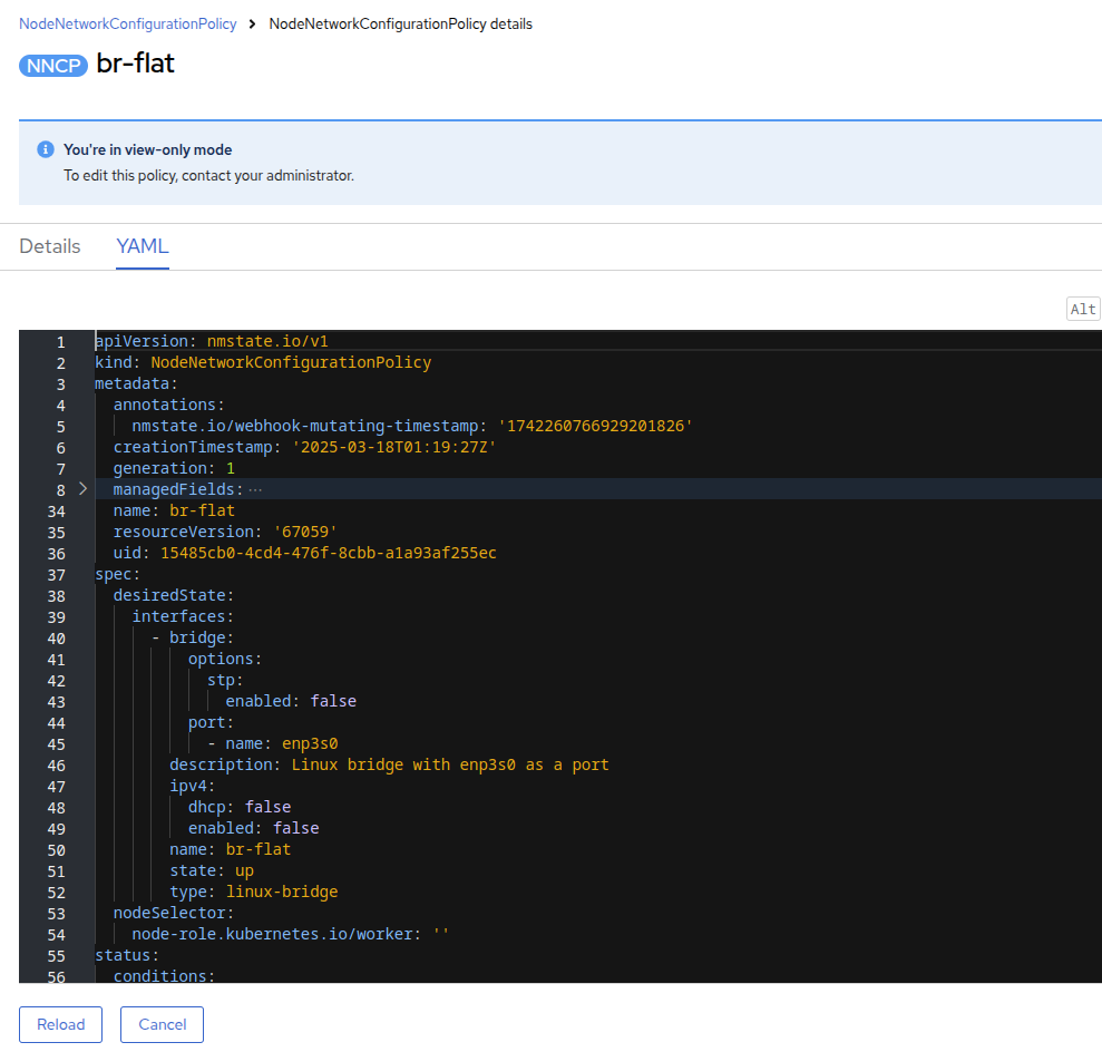 NodeNetworkConfigurationPolicy はノードレベルで構成を実行するため、現在のユーザーアカウントでこれらのオプションを変更することはできません。そのため、管理者に問い合わせるよう求められます。 -