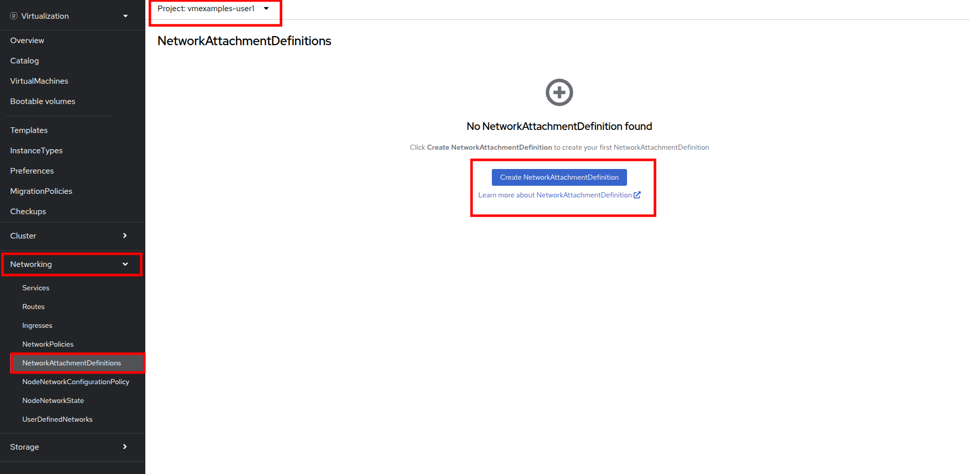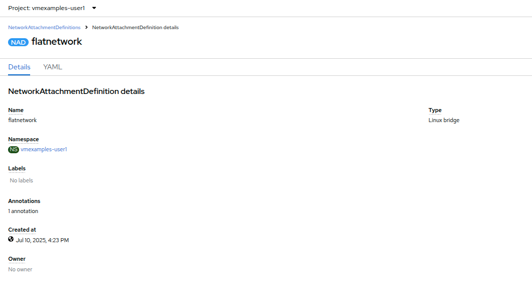 Network Attachment Definitionを作成する際には、vmexamples-{user}プロジェクト内であることを確認してください。 -