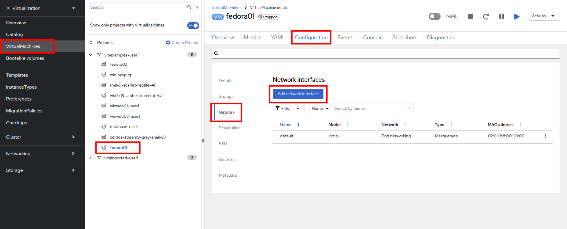 左側のメニューで VirtualMachines に移動し、中央の列から fedora01 VM を選択します。 Configuration タブをクリックし、左側の Network タブをクリックします。