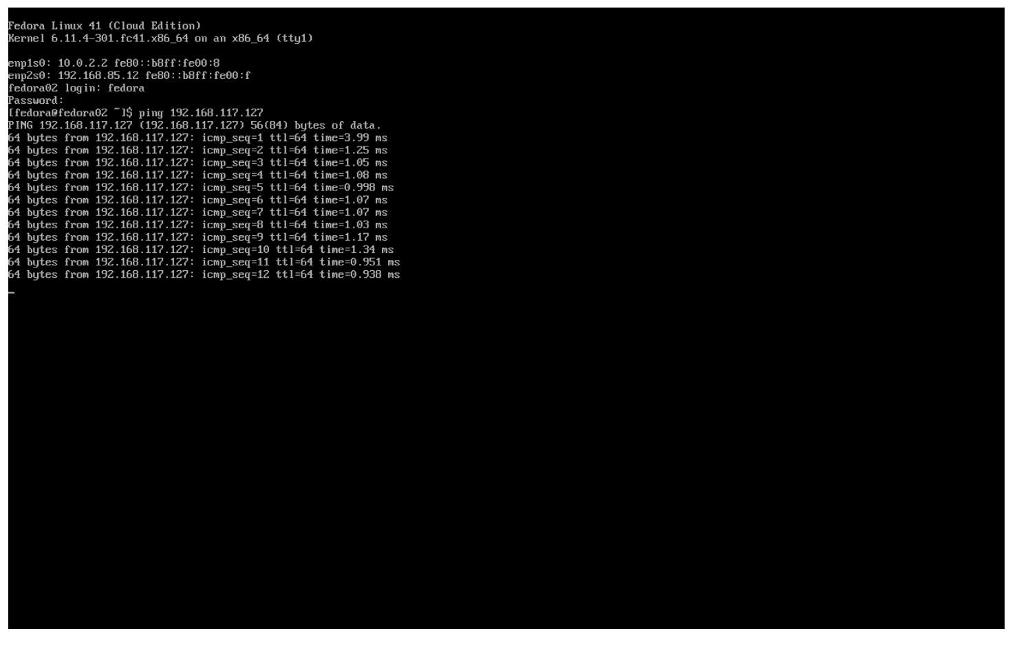 コンソールで ping コマンドを使用して、2つのVM(fedora01とfedora02)間の直接通信を実演します。