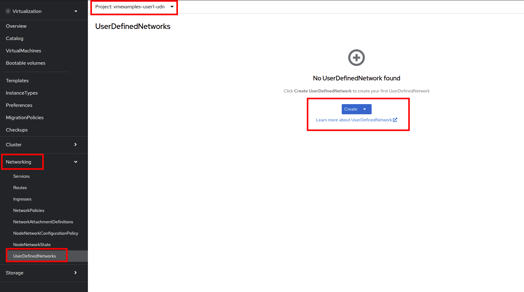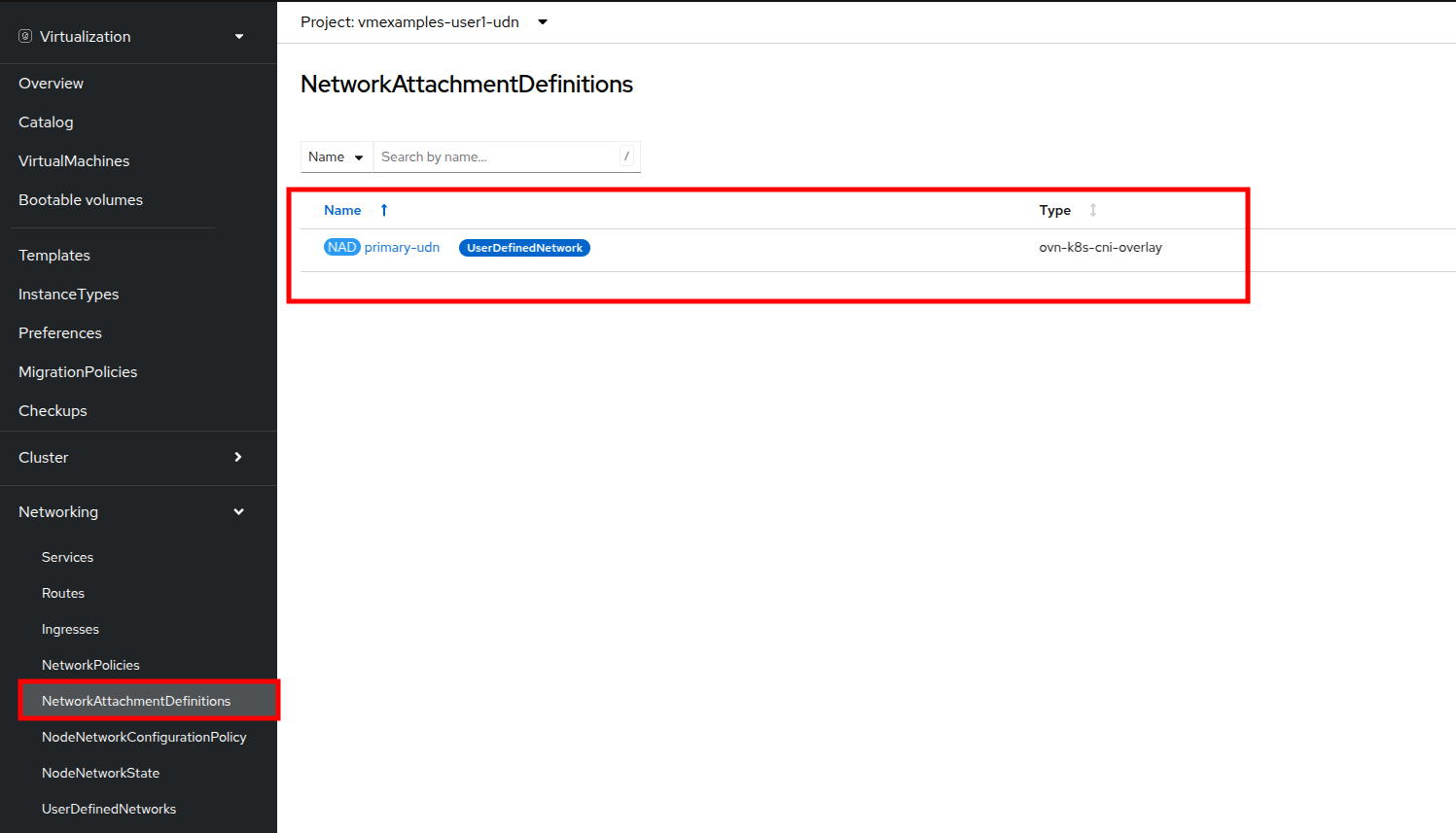 Network に移動し、User Defined Network をクリックして、プロジェクト vmexamples-{user}-udn が選択されていることを確認する。