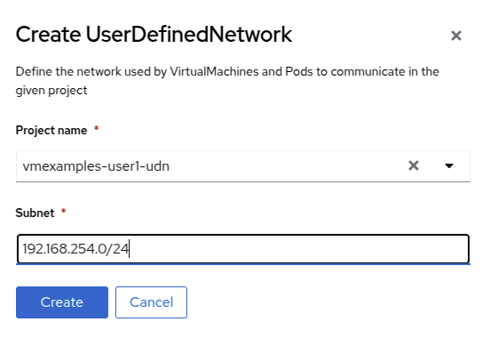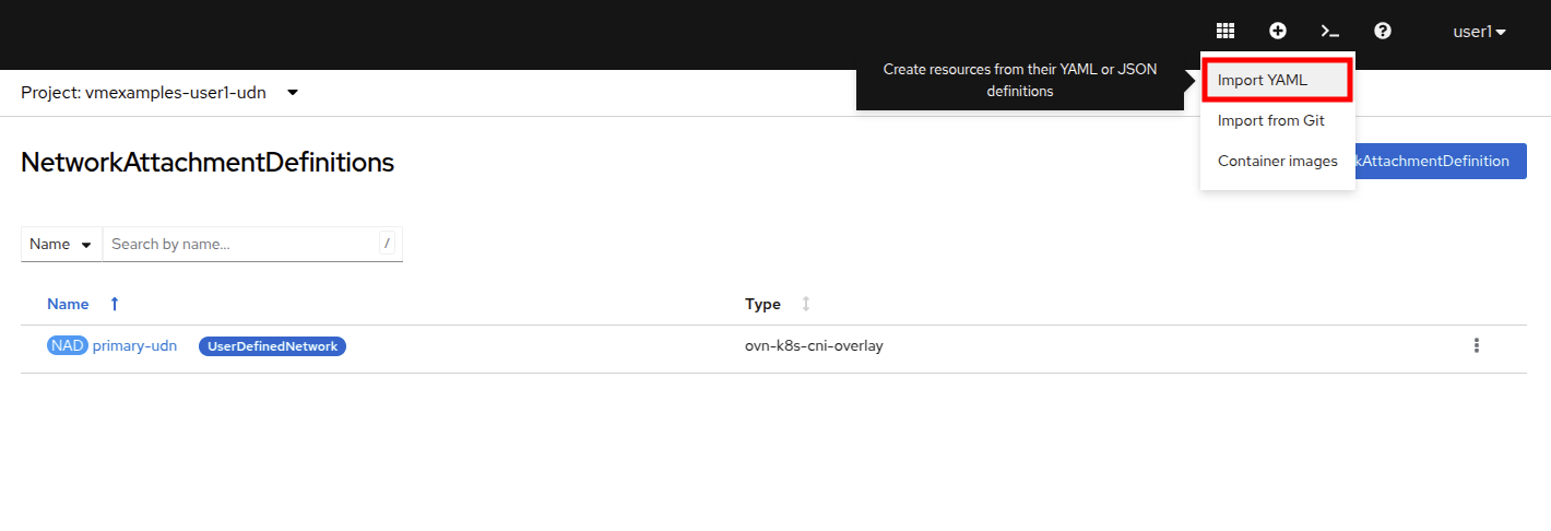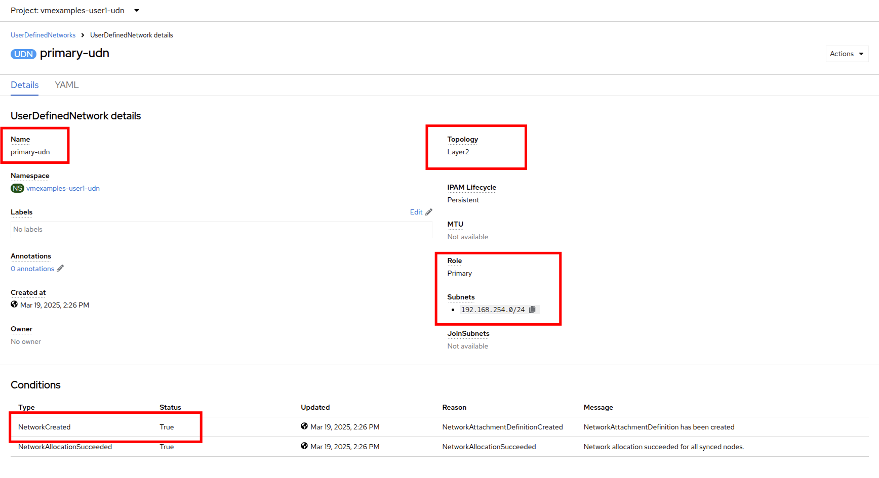 この作業はクラスタ管理者によって実行する必要があります。vmexamples-{user}-udn という名前空間を適切なラベル(k8s.ovn.org/primary-user-defined-network)とともに割り当てました