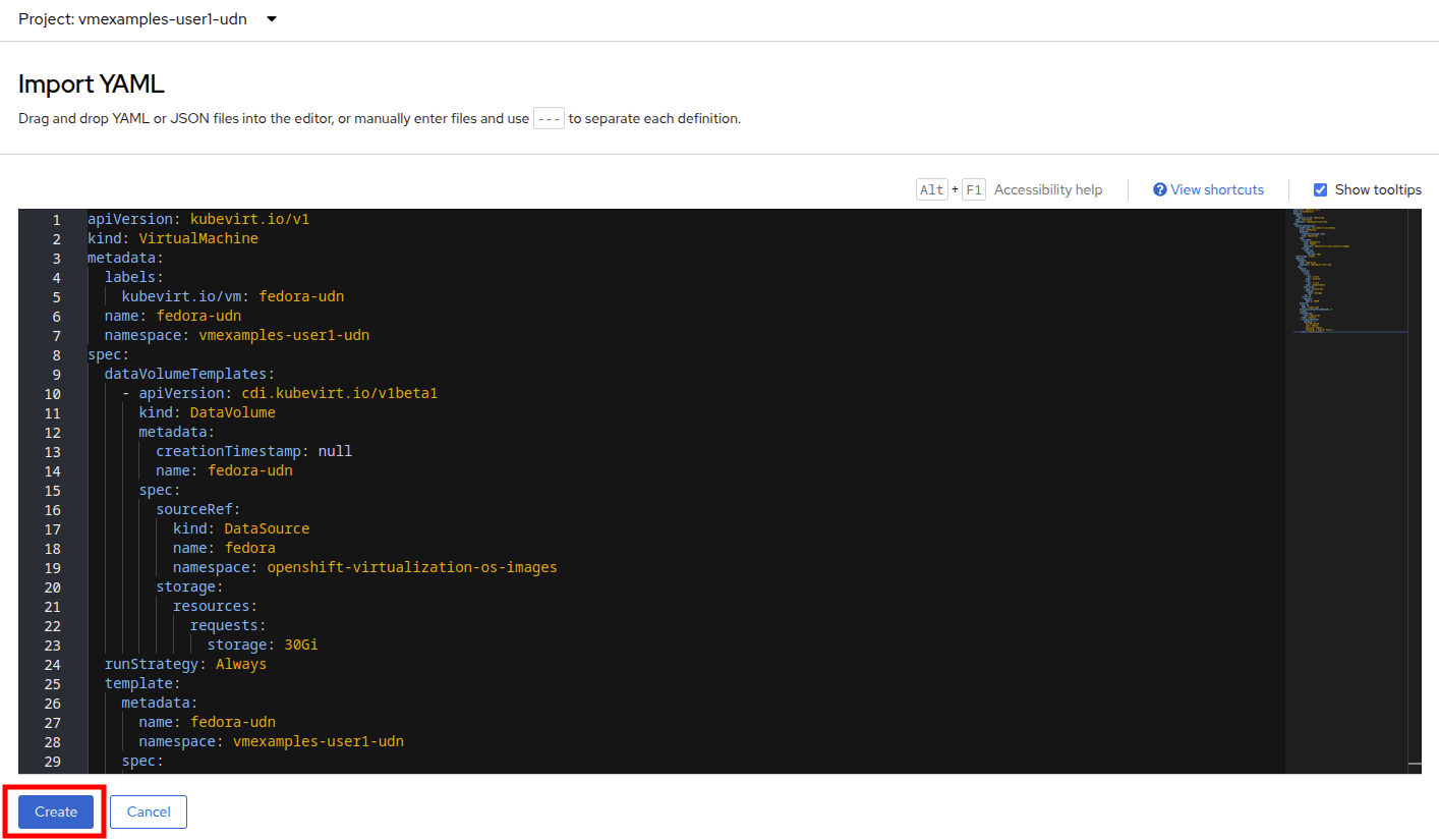 UserDefinedNetworkに接続された仮想マシンを作成するには、 YAML定義の調整 が必要です。このラボでは作業を簡単にするため、以下のYAML定義を使用し、UserDefinedNetworkに接続されたVMを作成します。