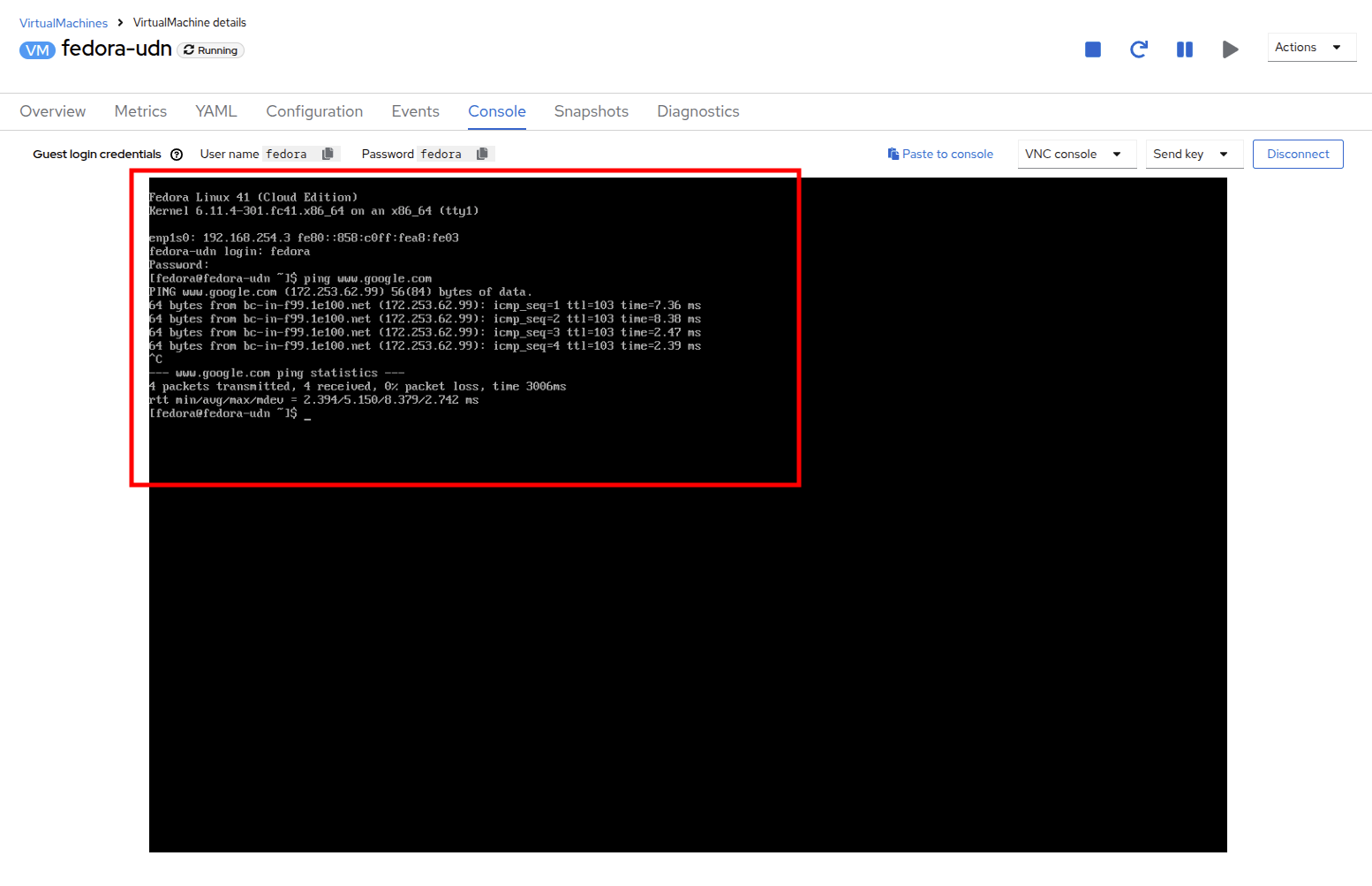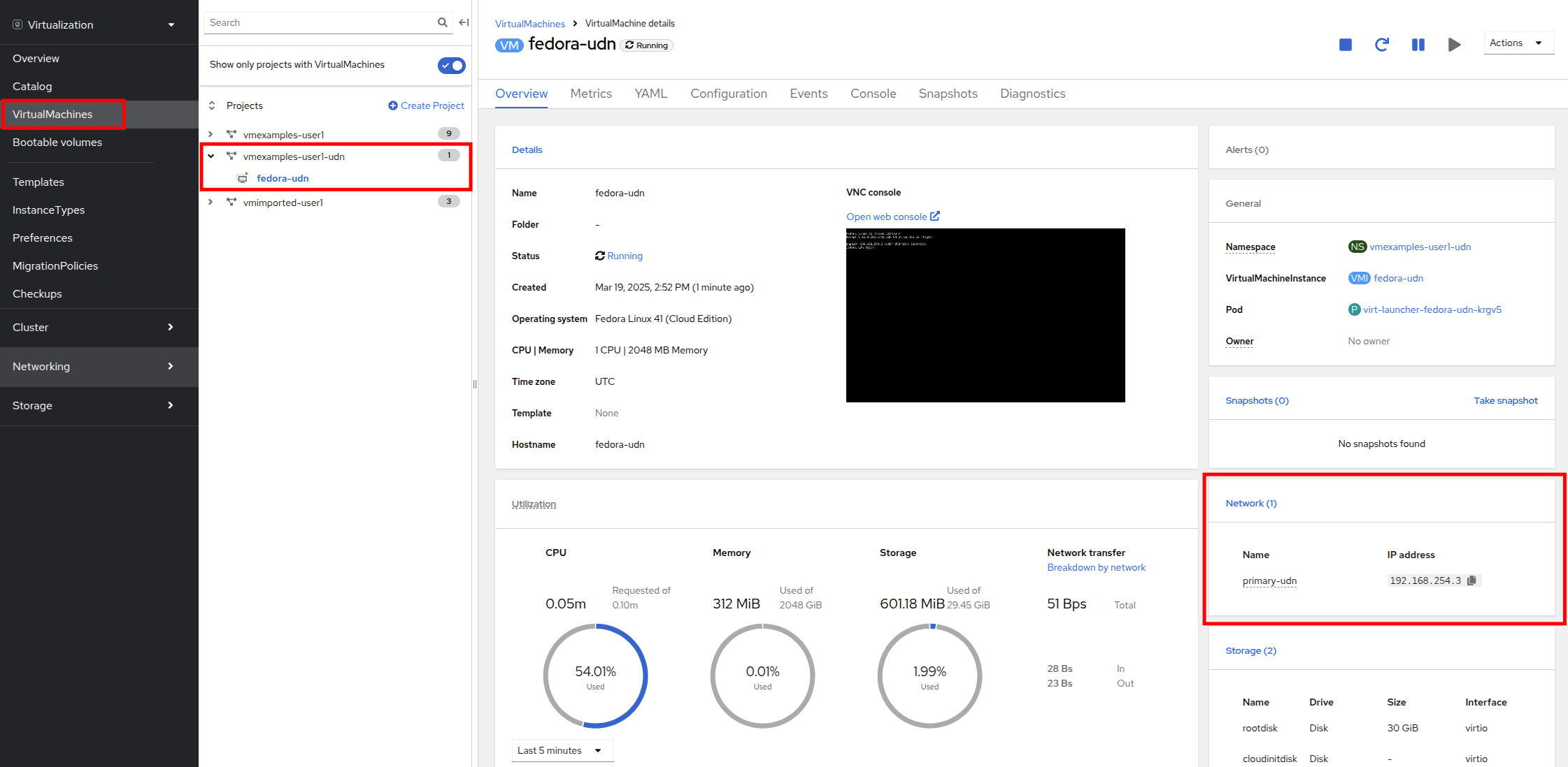 VirtualMachines に切り替えて、VM が作成されるのを見ます。 作成されたら、新たに作成された fedora-udn 仮想マシンを確認します。 Overview タブの Network タイルに、UserDefinedNetwork から割り当てられた IP が表示されます。