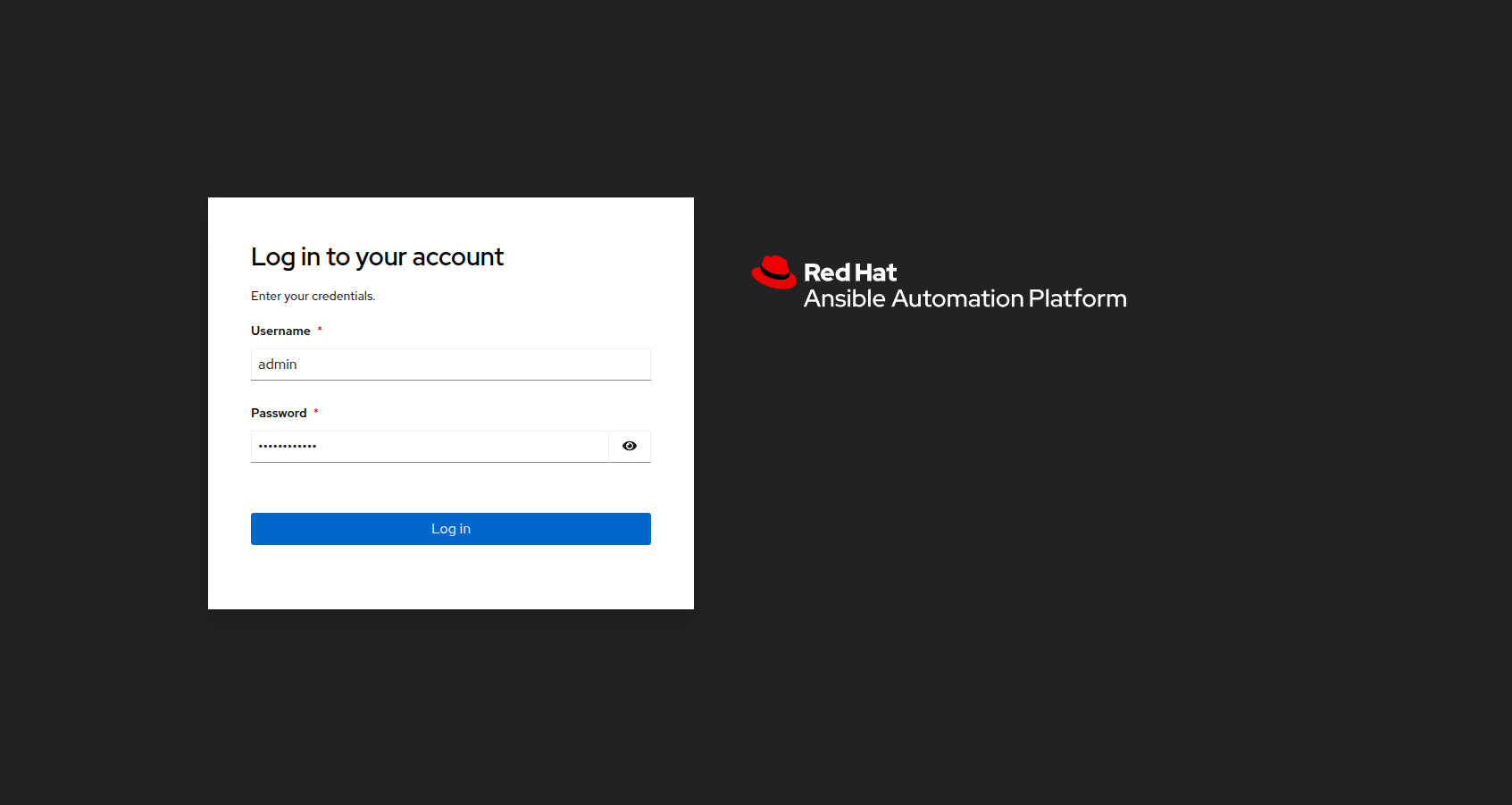 Ansible Automation Platform コンソールは {aap_controller_web_url}[こちら^] から利用できます。 管理者ログインには、以下の認証情報が利用できます: