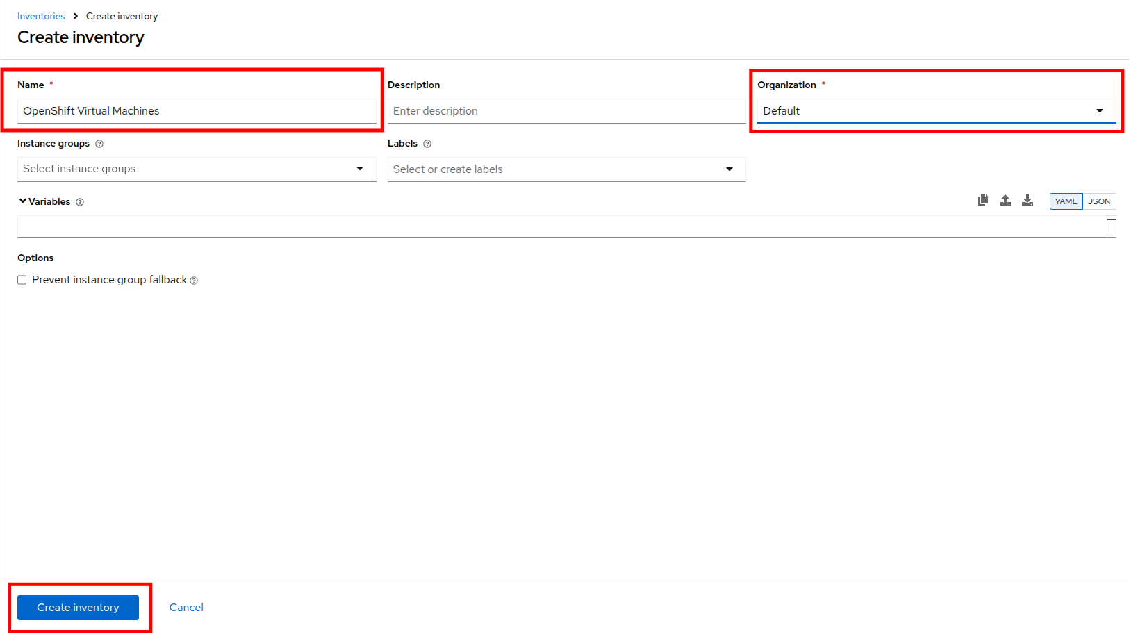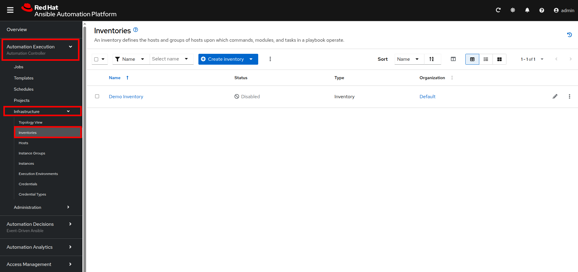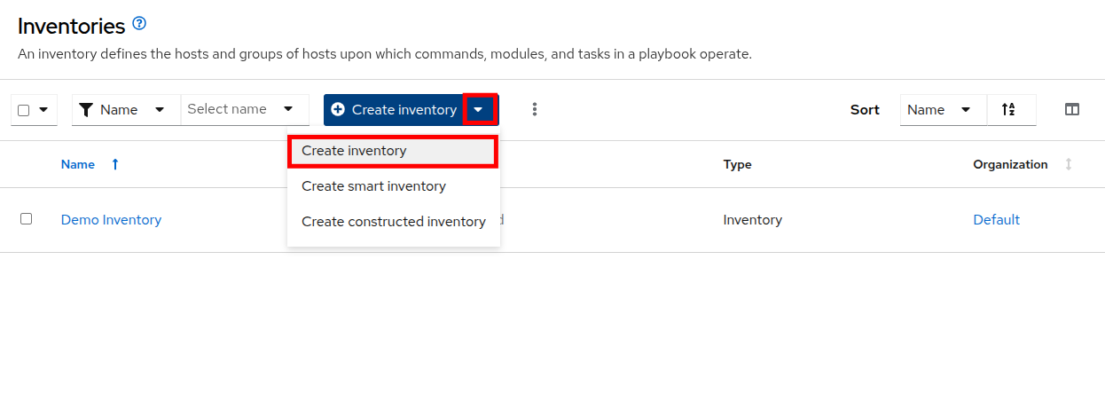 Create inventory ドロップダウンボックスをクリックし、Create inventory オプションを選択します。