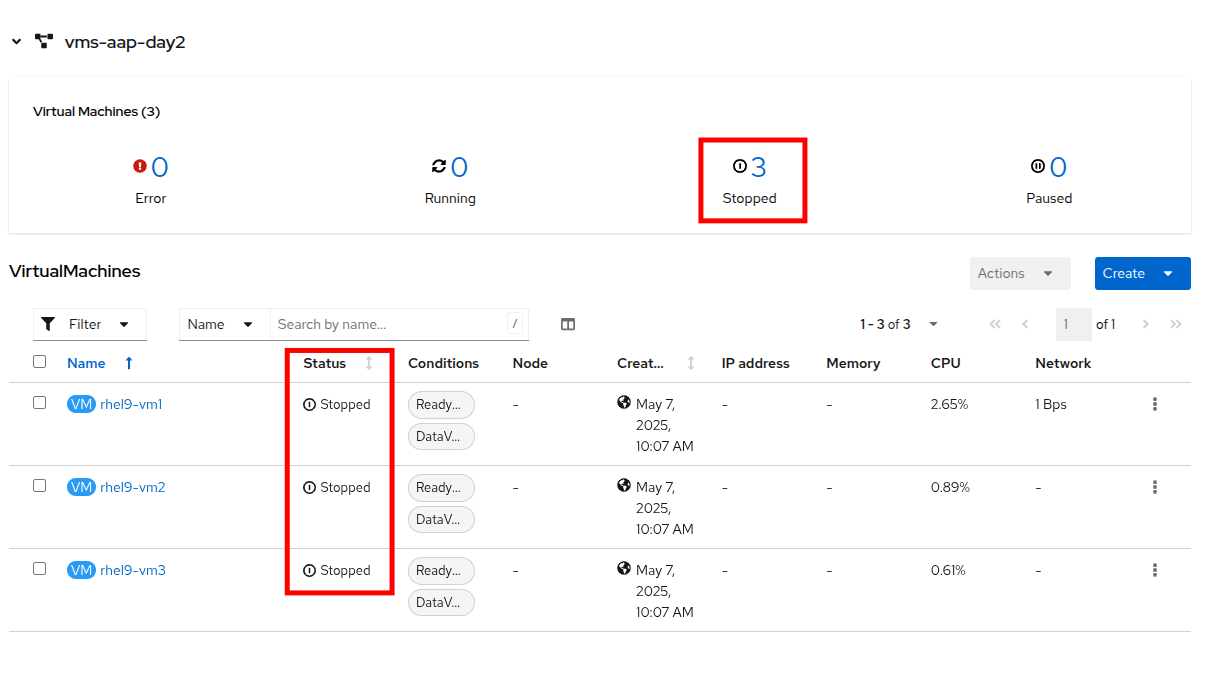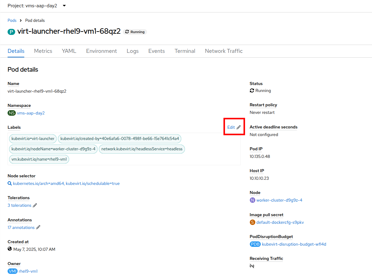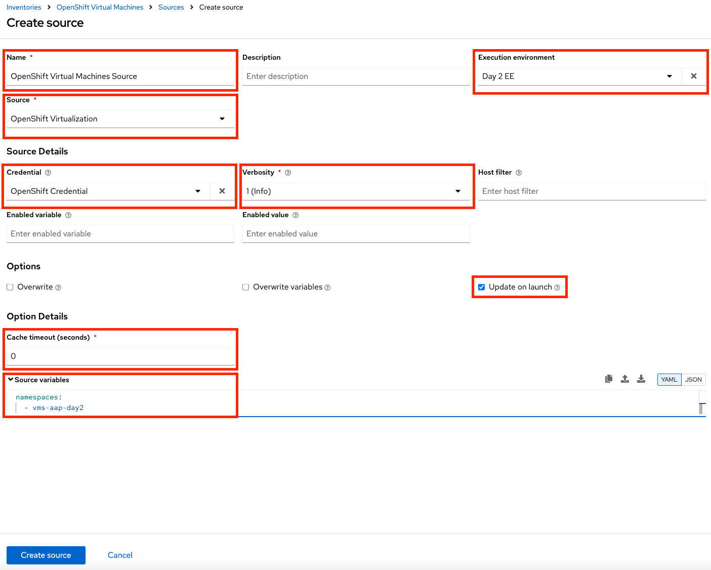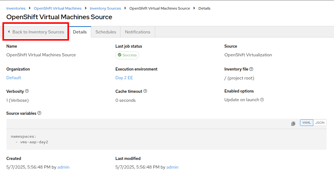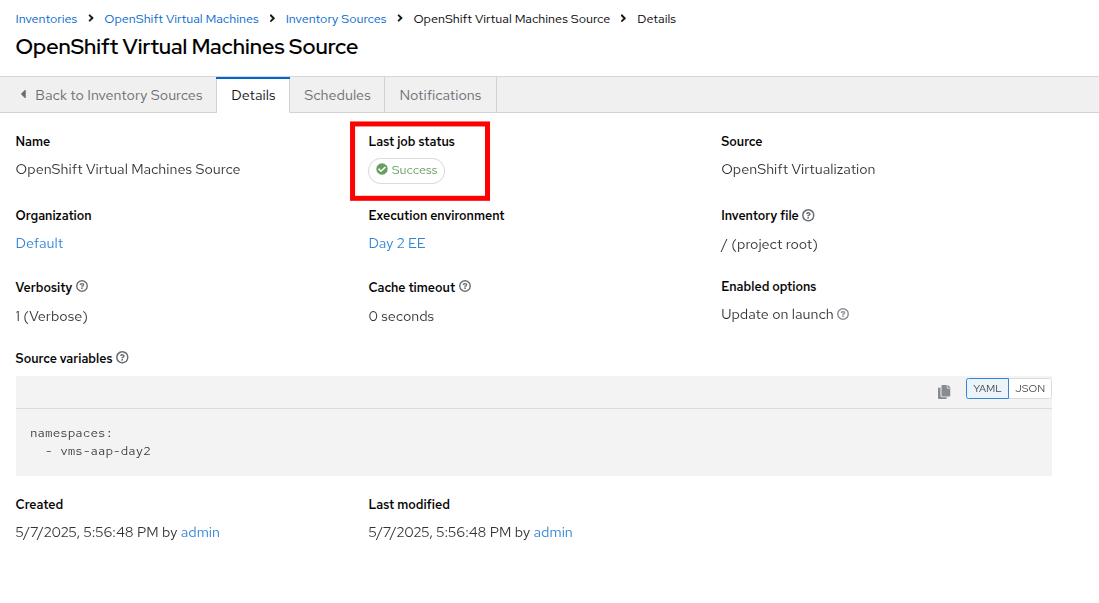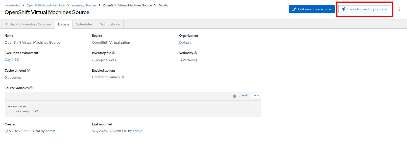 このラボでは、OpenShift Virtualization からデータを取得するための動的インベントリーを設定します。 これにより、AAP は OCP クラスターの vms-aap-day2 名前空間に存在する OpenShift VM を管理できるようになります。