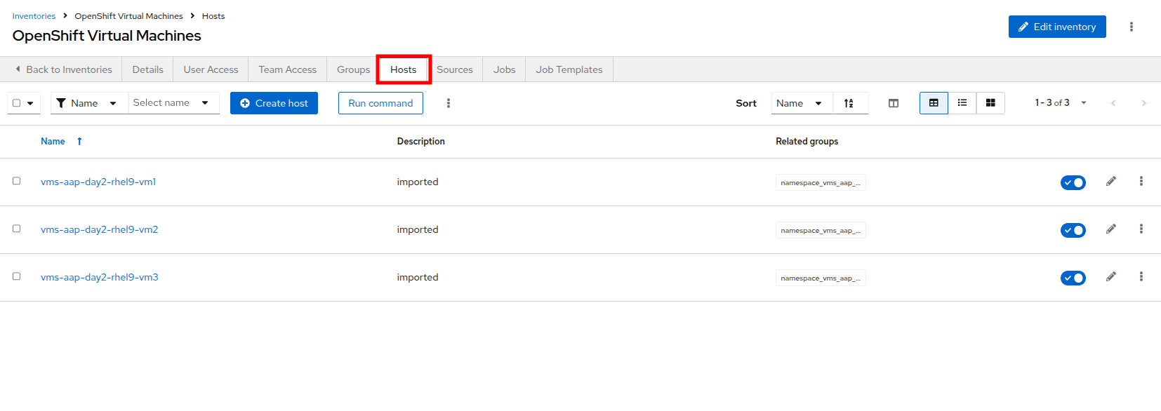 OpenShift クラスターの vms-app-day2 名前空間からの仮想マシンがインベントリーホストとしてリストされていることを確認します。