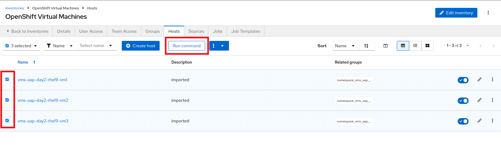 マシンが動作していることを確認するため、検出された 3 つの VM を選択し、Run command ボタンをクリックして自動化された ping ジョブを実行できます。