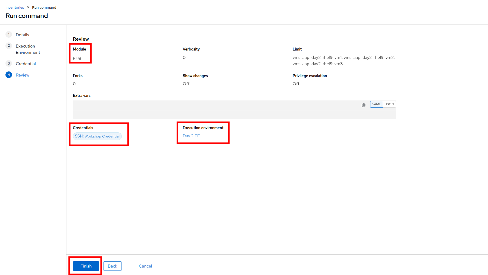 Credential ページで、Credential ドロップダウンから Workshop Credential を選択し、Next をクリックします。