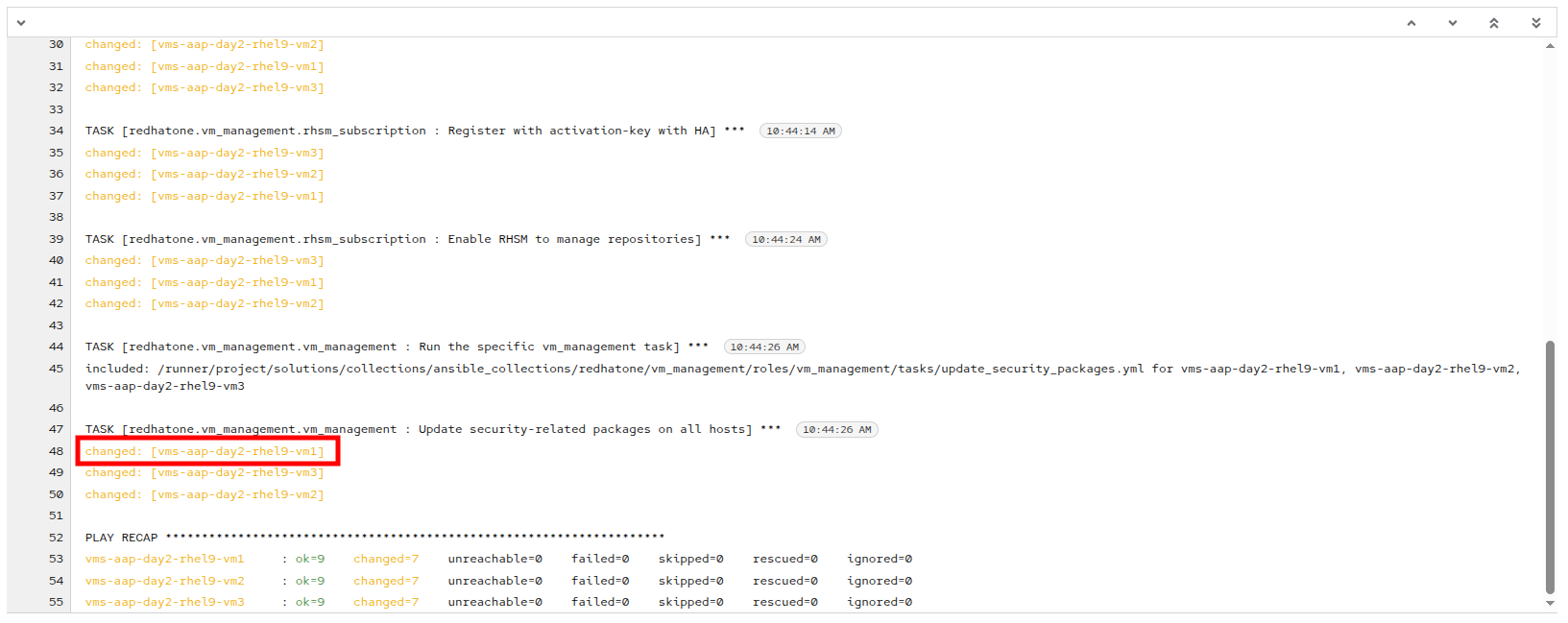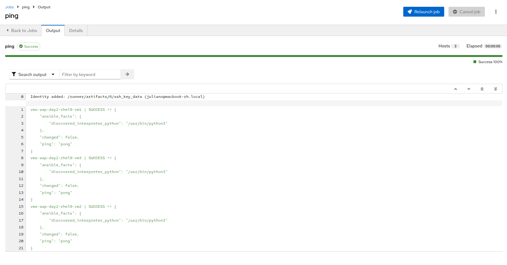 vms-aap-day2-rhel9-vm1 | SUCCESS => { "ansible_facts": { "discovered_interpreter_python": "/usr/bin/python3" }, "changed": false, "ping": "pong" } vms-aap-day2-rhel9-vm2 | SUCCESS => { "ansible_facts": { "discovered_interpreter_python": "/usr/bin/python3" }, "changed": false, "ping": "pong" } vms-aap-day2-rhel9-vm3 | SUCCESS => { "ansible_facts": { "discovered_interpreter_python": "/usr/bin/python3" }, "changed": false, "ping": "pong" }