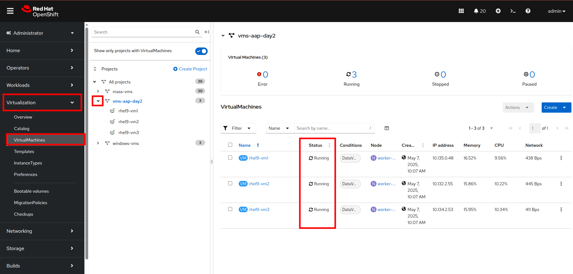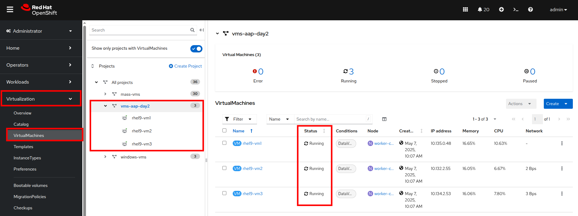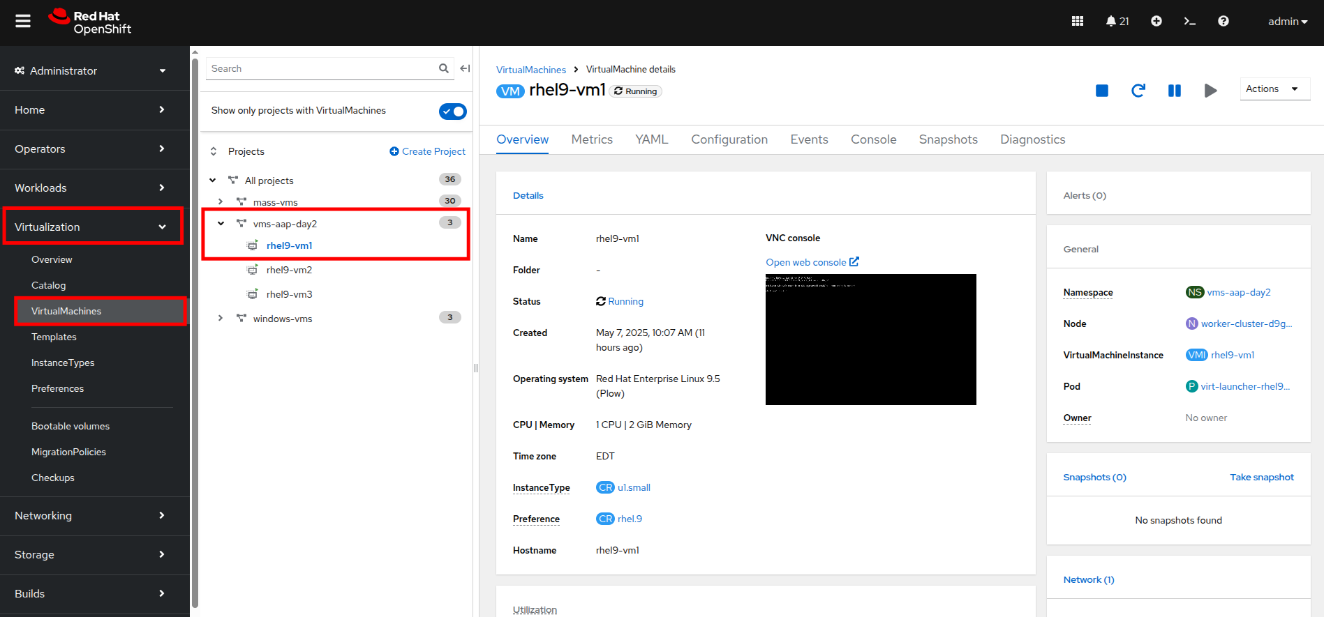 OpenShift コンソールにログインし、仮想マシンを手動で確認することで、VM が実行されていることを手動で確認することもできます。