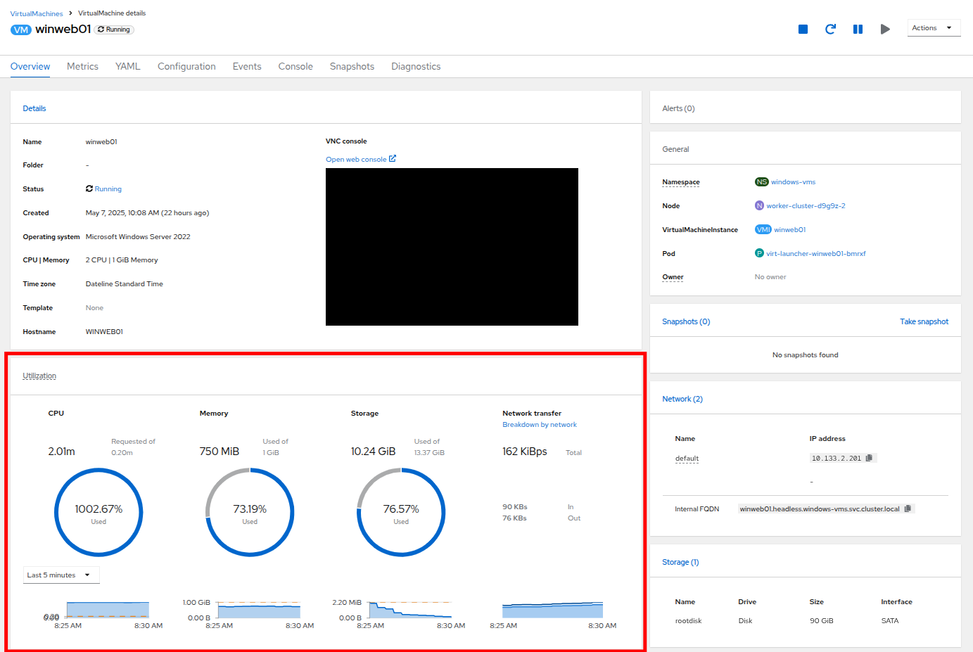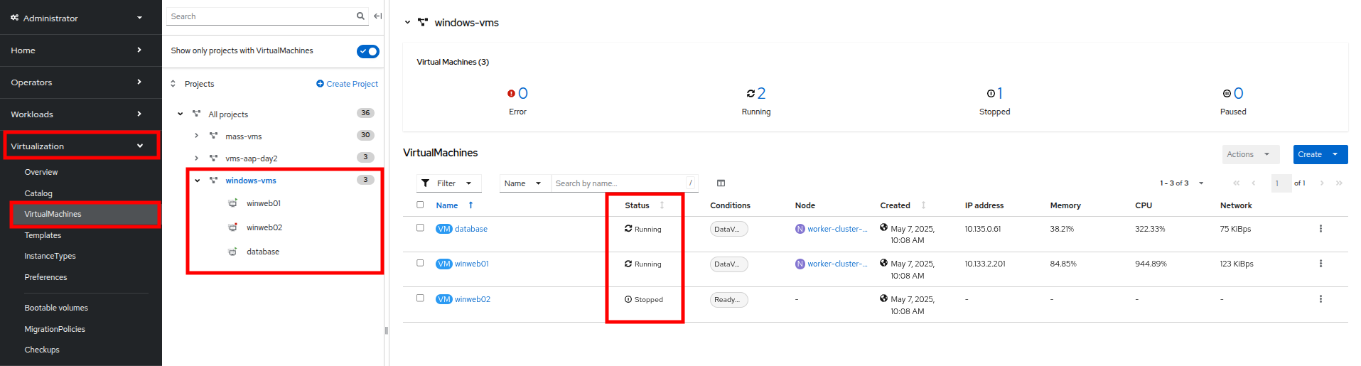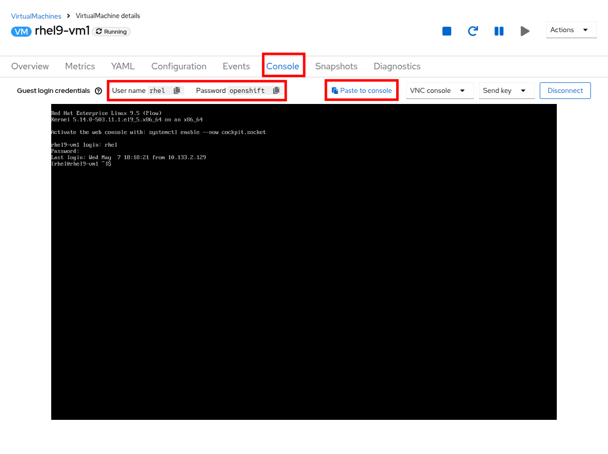 OpenShift コンソールにログインし、仮想マシンを手動で確認することで、VM が実行されていることを手動で確認することもできます。