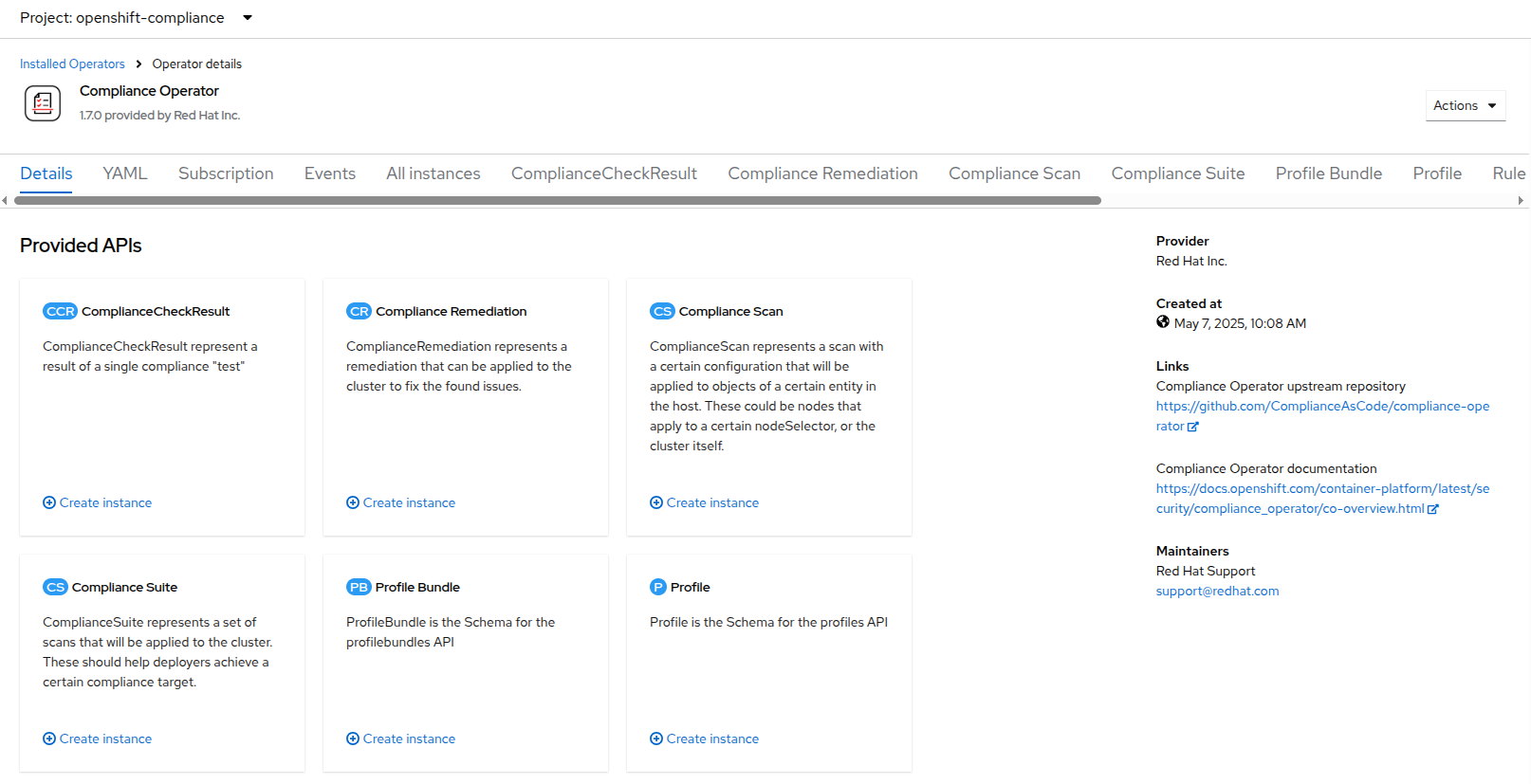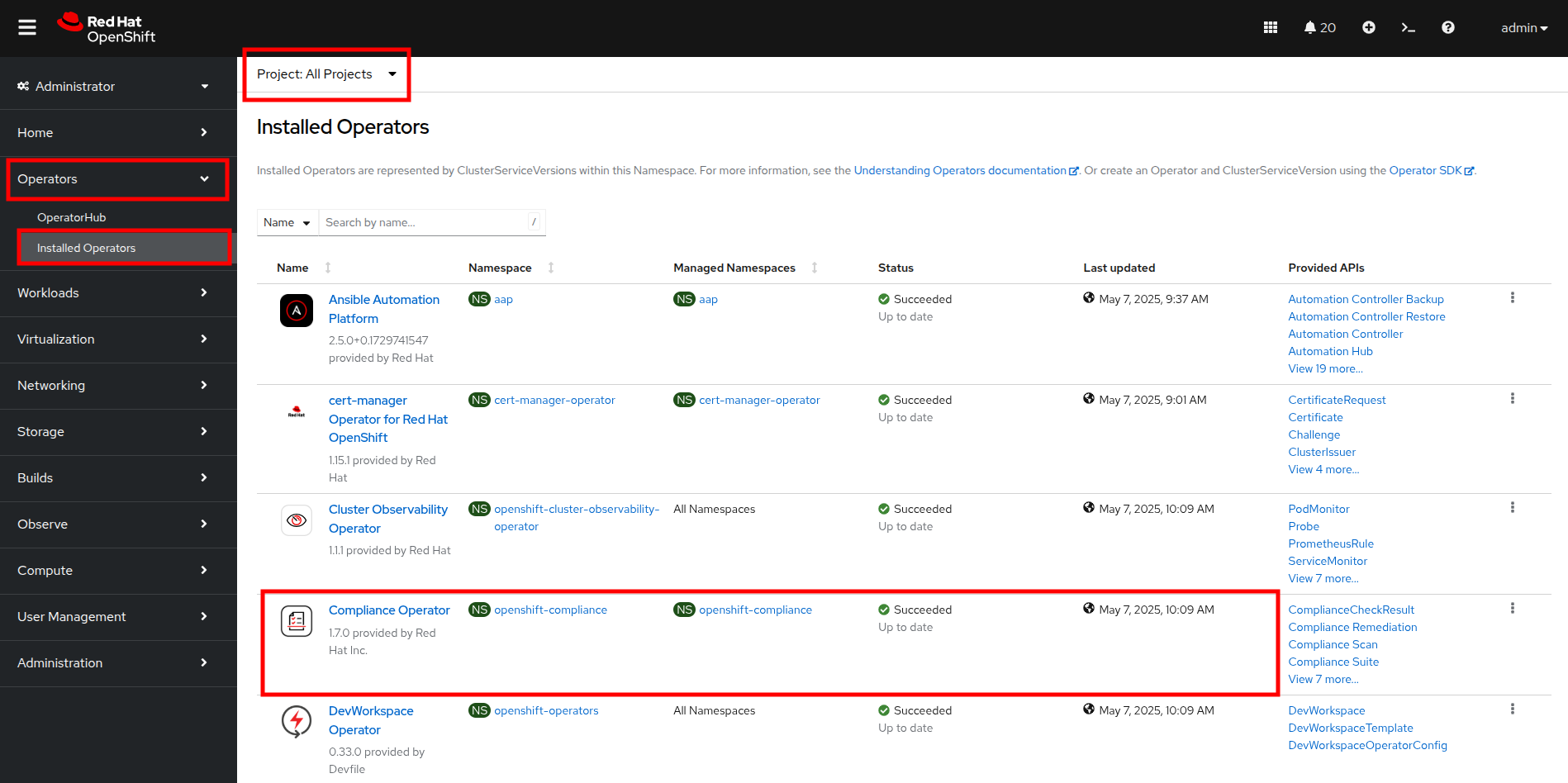 左側のナビゲーションメニューから Operators、次に Installed Operators を選択し、All Projects が選択されていることを確認して Compliance Operator を選択します。