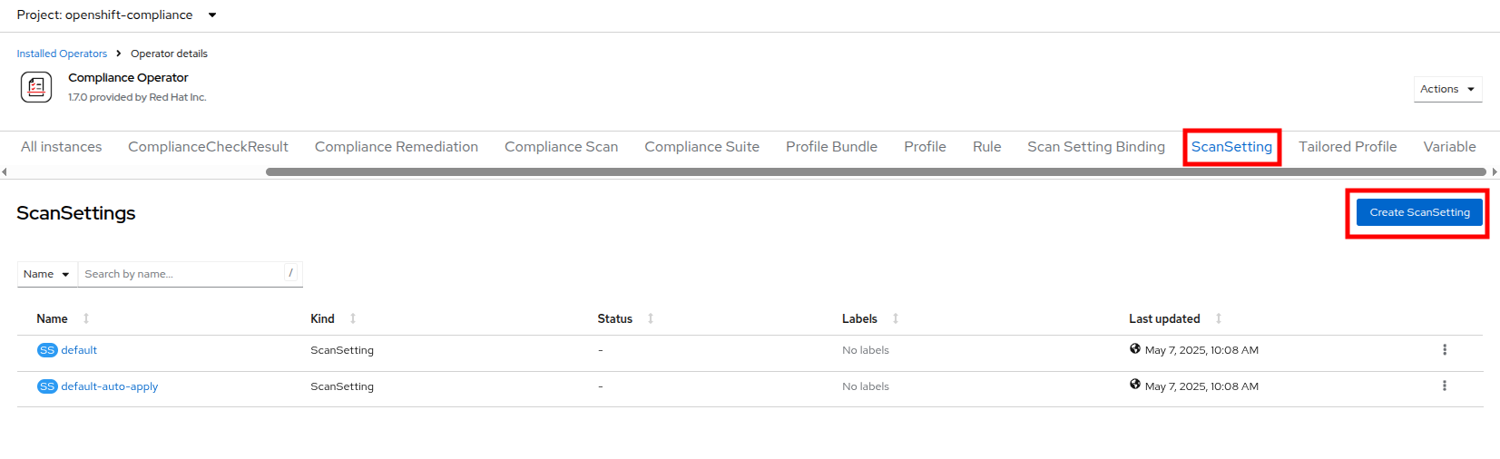 ScanSetting YAML の詳細で、デフォルトで設定されている以下の値に注意してください: