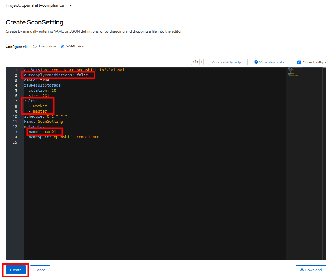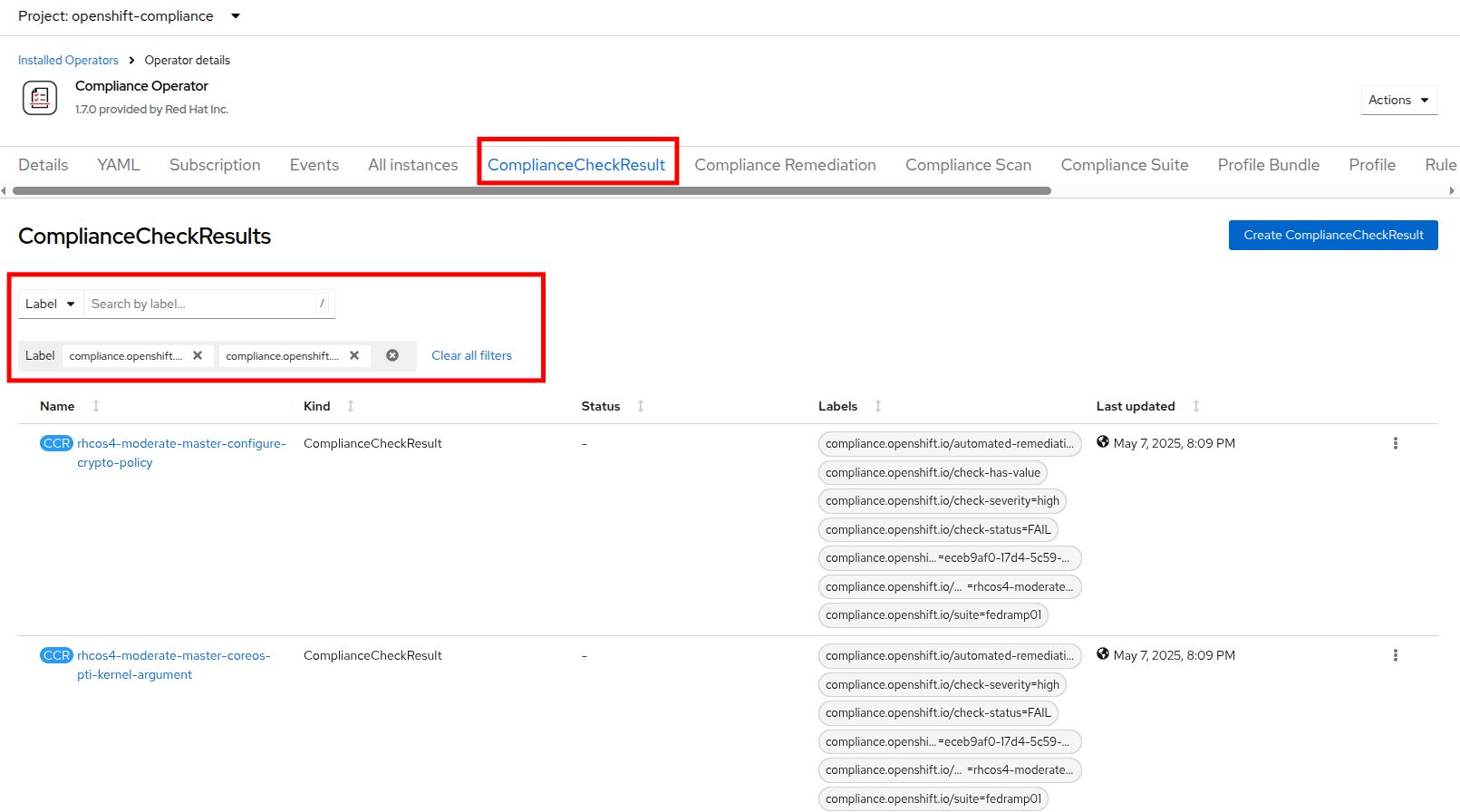 この Compliance Suite は、定義されたスキャンを、今回のケースでは scan01 で定義されたマスターノードとワーカーノードに対して実行します。