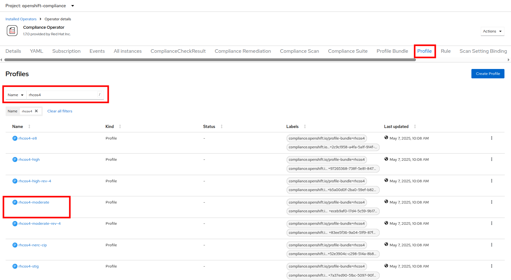 プロファイルはデフォルトで rhcos4-moderate (fedramp moderate プロファイル) に設定されています。 -