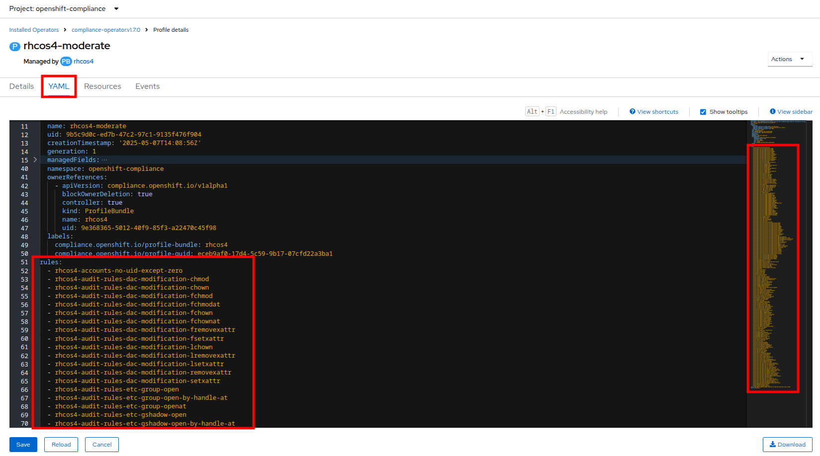 rhcos4-moderate をクリックし、次に YAML をクリックします。 出力を下にスクロールして、このスキャンの一部として適用されるルールを閲覧します。 サイドパネルをちらっと見ると、かなりの数のルールがあることがわかります。