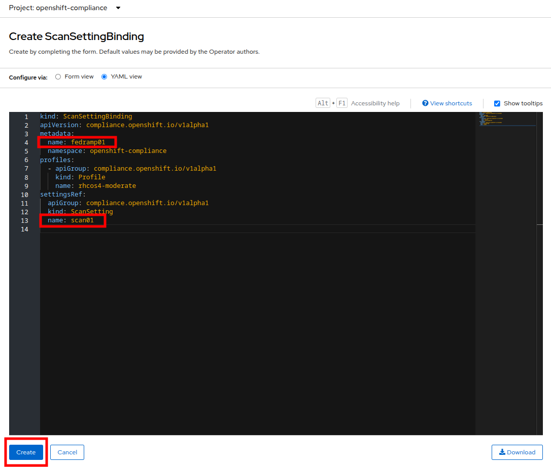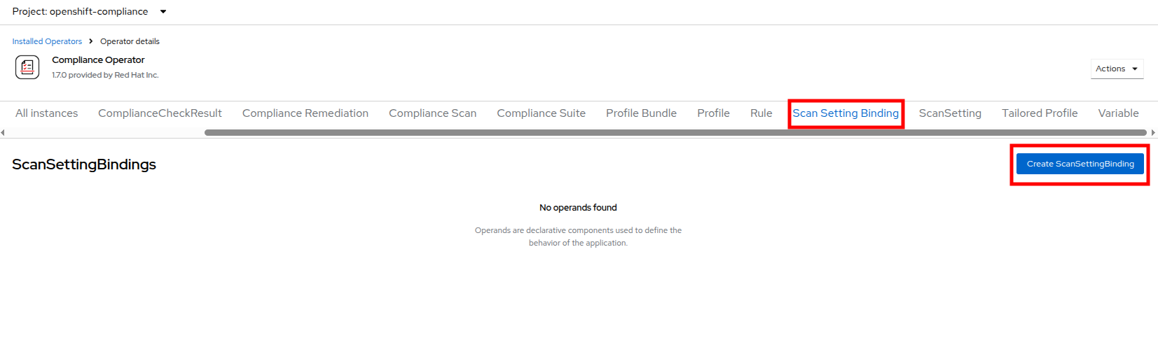 次に、作成した ScanSetting 定義と Profile をペアリングする ScanSettingBinding を作成します。 これを行うには、Scan Setting Binding タブに移動し、Create ScanSettingBinding ボタンをクリックします。