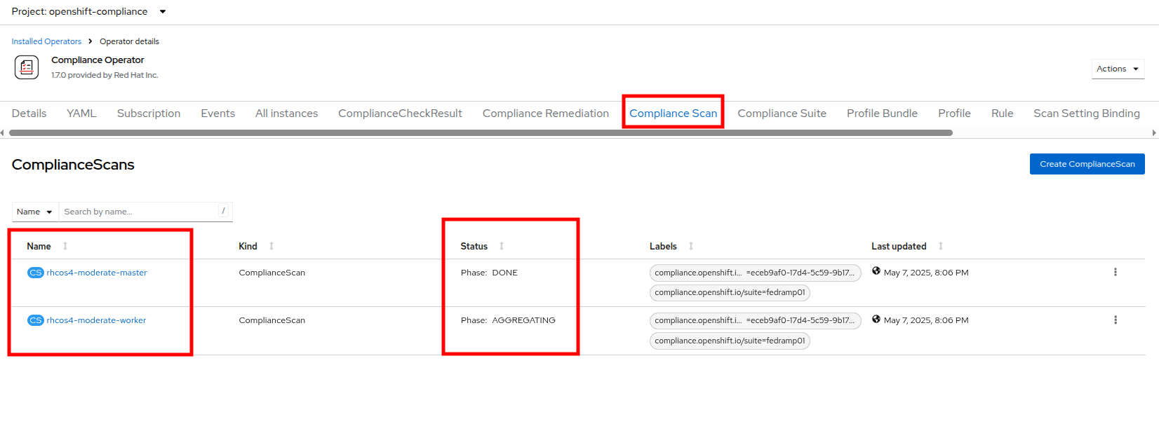 Compliance Scan タブをクリックすることで、スキャンが RUNNING, AGGREGATING, DONE のステップを経て進行するのを監視できます。