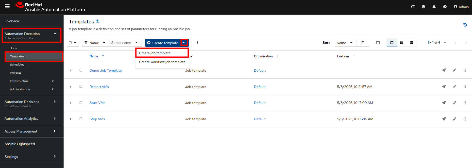 AAP UI ダッシュボードにアクセスし、Automation Execution → Templates に移動します。