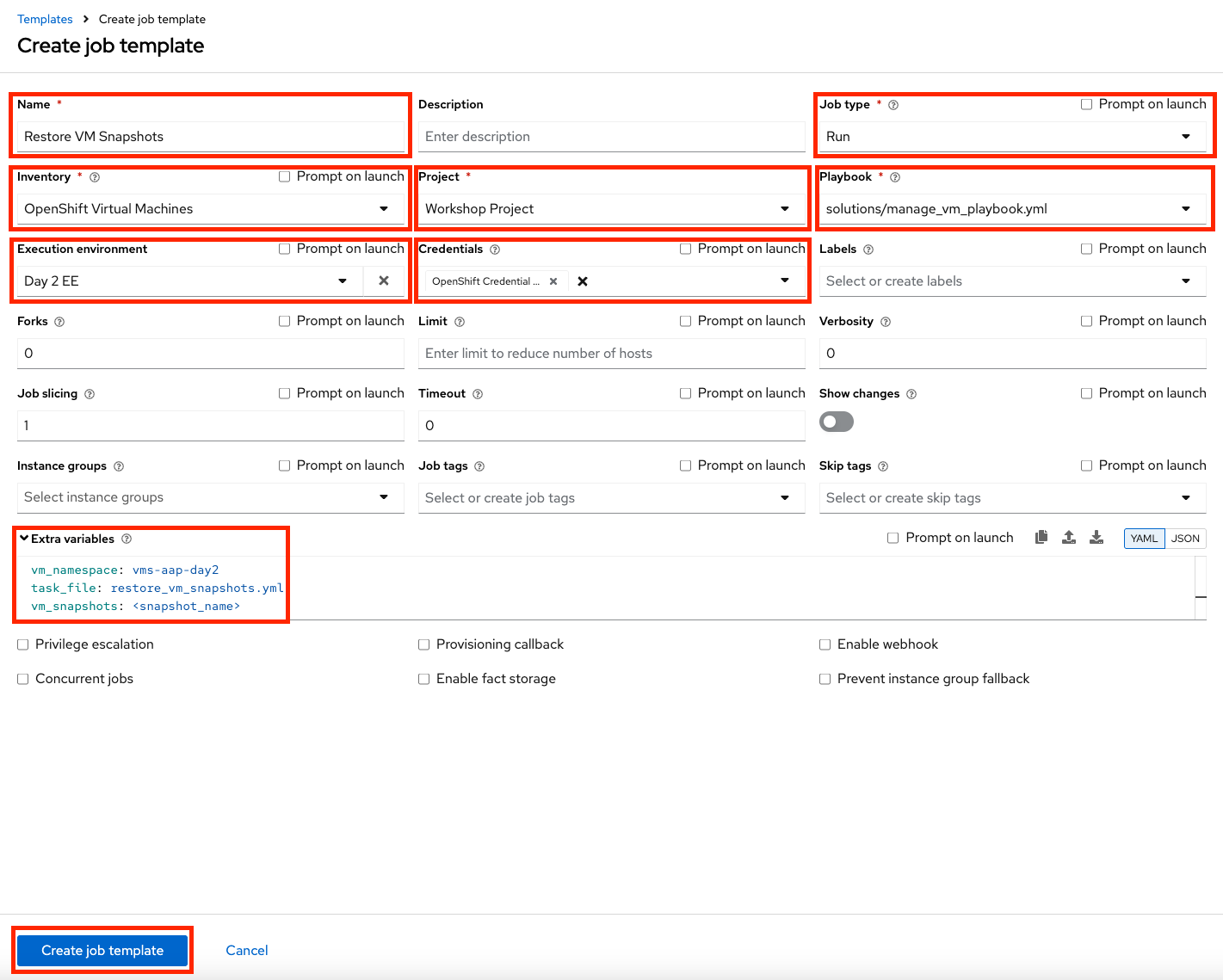 Restore VM Snapshots ジョブテンプレートの作成と実行